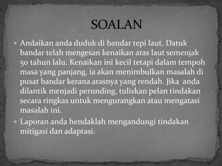 Dokumen ini membincangkan kesan kenaikan aras laut yang dikesan di bandar tepi laut selama 50 tahun dan pelan tindakan untuk mengatasi masalah ini. Ia menggariskan tindakan mitigasi dan adaptasi seperti penanaman pokok, pengurusan tanah yang baik, dan pengurangan penggunaan penyaman udara untuk mengatasi pemanasan global. Kesedaran dan tanggungjawab individu juga ditekankan untuk mengurangkan kesan negatif terhadap persekitaran.