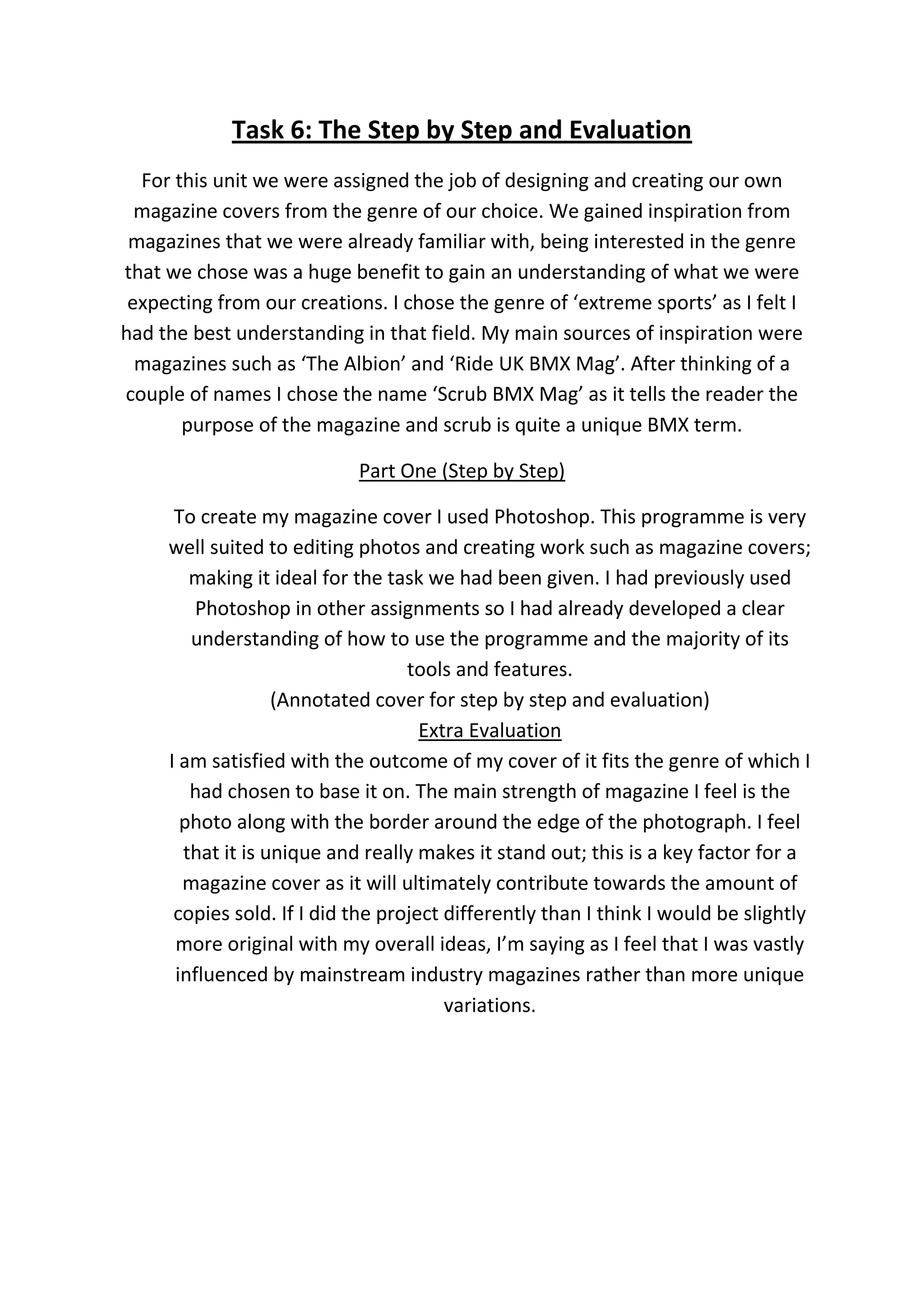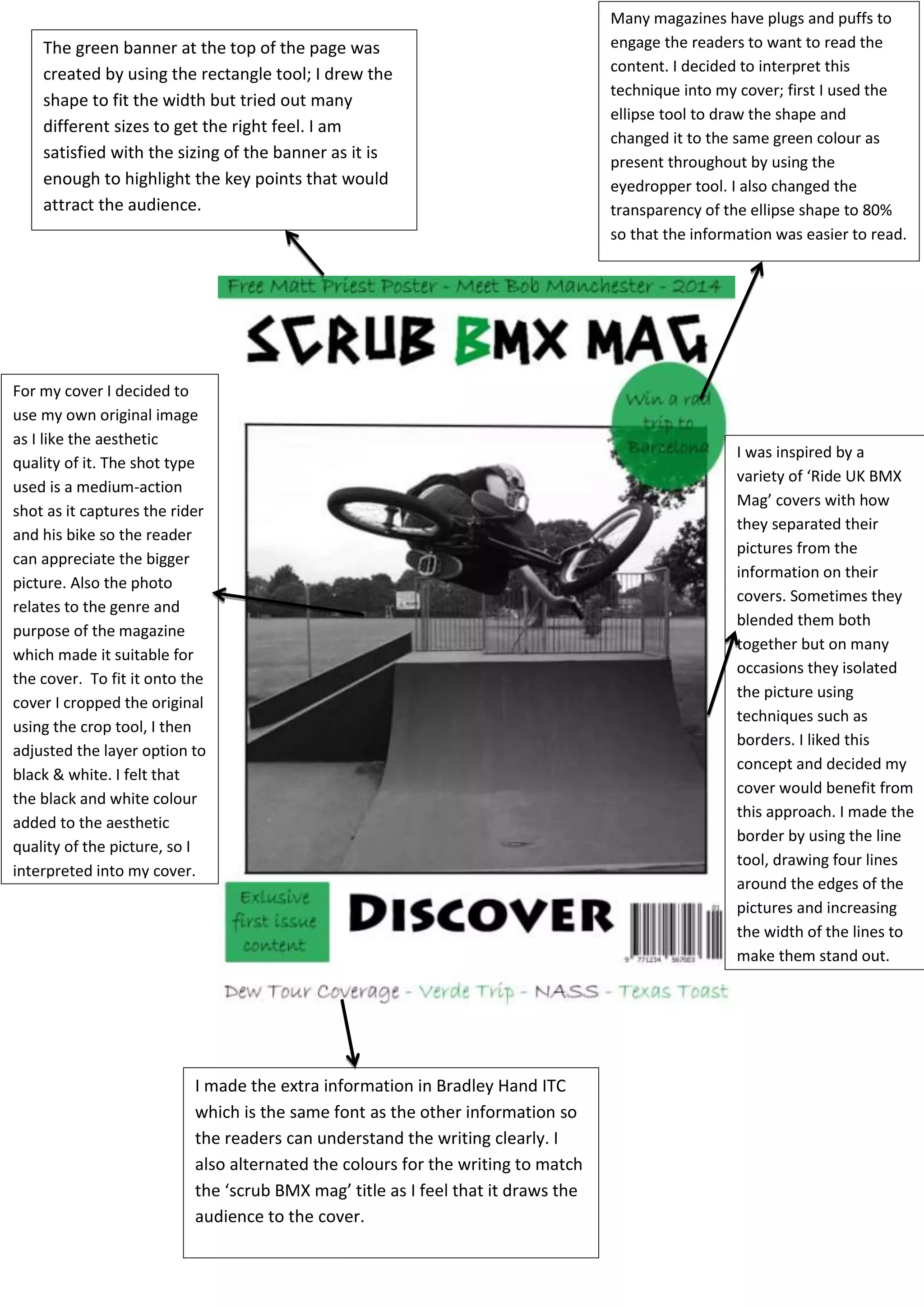 The document summarizes the process taken to design a magazine cover for an extreme sports magazine called "Scrub BMX Mag". Photoshop was used to edit photos and create the cover. An original action photo of a BMX rider was selected and cropped for the cover. A black and white filter was applied to give it an aesthetic quality fitting for the genre. Inspiration was taken from existing magazines like "Ride UK BMX Mag" in using borders and separating photos from text. Additional design elements like colored banners and shapes were added to highlight key information and engage readers as is common for magazine covers. The outcome fits the genre chosen and key strengths are the unique border around the photo and design elements that make it stand out