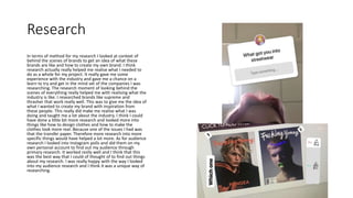 The document provides a self-evaluation by Emma Garthwaite of her research, planning, production, post-production, and final product for a project creating a magazine and clothing brand. She found her research and audience research especially helpful. Her planning could have been more detailed. Production went well overall despite some challenges with models and photo shoots. Post-production editing took longer than planned but turned out well. Technical issues prevented her from creating the clothing brand as intended. While her final product did not fully meet her original intentions, she was ultimately happy with the magazine she created.