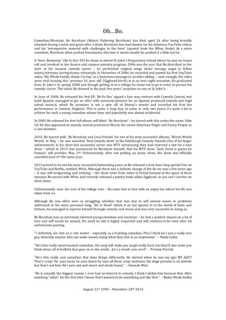 Comedian and musician Bo Burnham died at age 24 after being attacked by an angry fan near the end of his college tour. Burnham was known for his YouTube videos and introspective comedy that pushed boundaries. He had a successful career over just a few years, releasing albums and specials that were critically acclaimed. Though struggling at times with fame and its effects, Burnham expressed himself through comedy and music and had a positive impact on many fans before his untimely death in 2014.