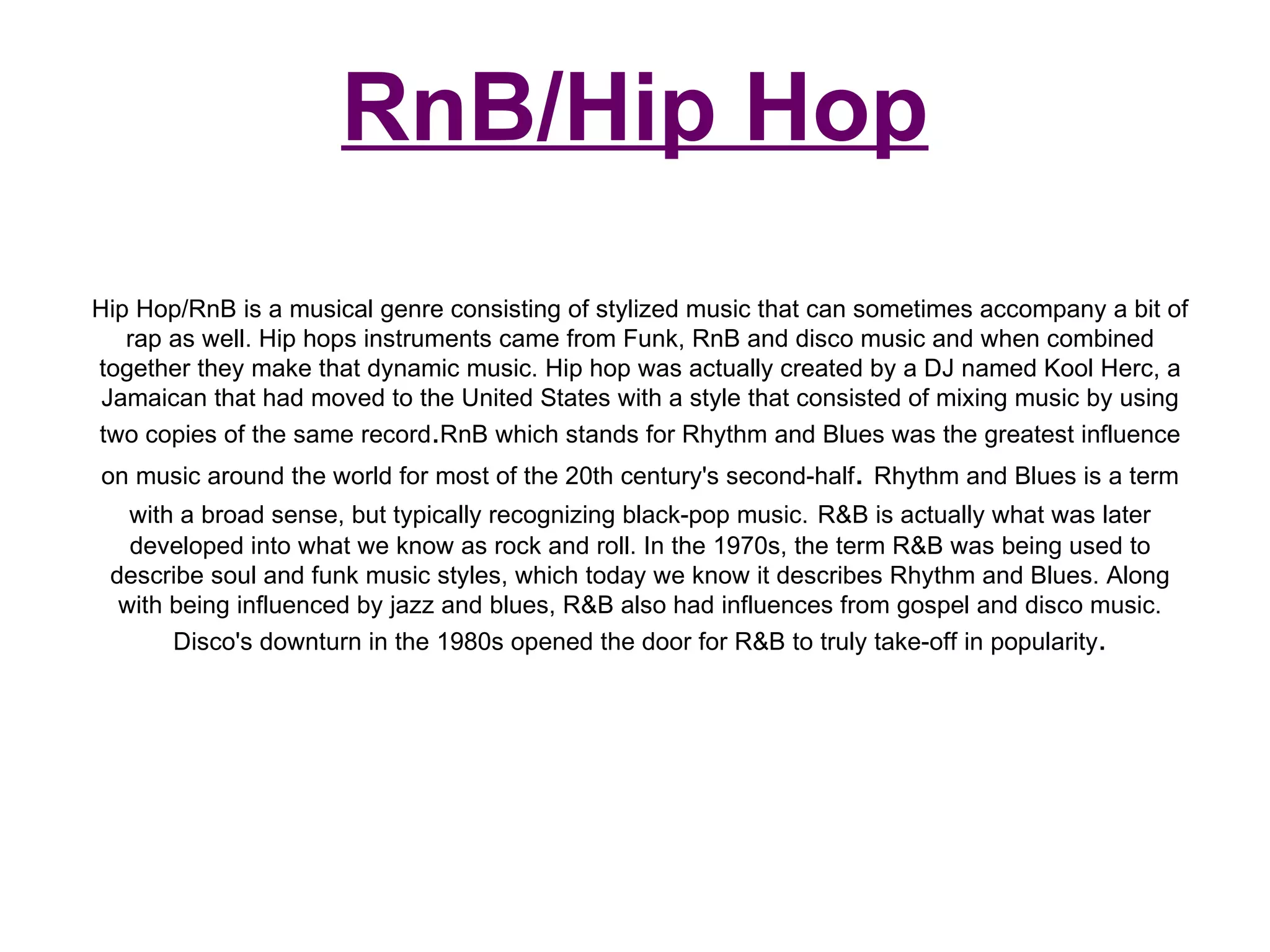 RnB/Hip Hop is a genre that blends elements of RnB, hip hop, funk, disco and jazz. It originated from DJ Kool Herc mixing songs using two copies of the same record. RnB, which stands for Rhythm and Blues, had its origins in blues and jazz and influenced various 20th century music styles like rock and roll. Popular artists in the genre include Jay-Z, Kanye West, Dr. Dre, Eminem, Drake and Lil Wayne.