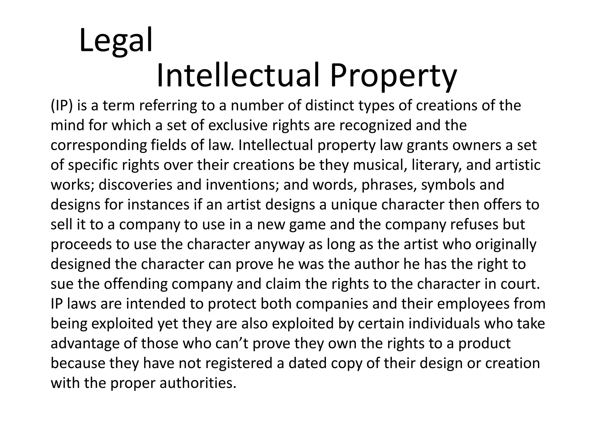 Intellectual property refers to creations of the mind like works, inventions, words and designs. IP laws grant owners exclusive rights over their creations and protect companies and individuals from exploitation. However, some take advantage by using creations without proving ownership. Different types of IP include copyright, trademarks, patents, and registered designs.