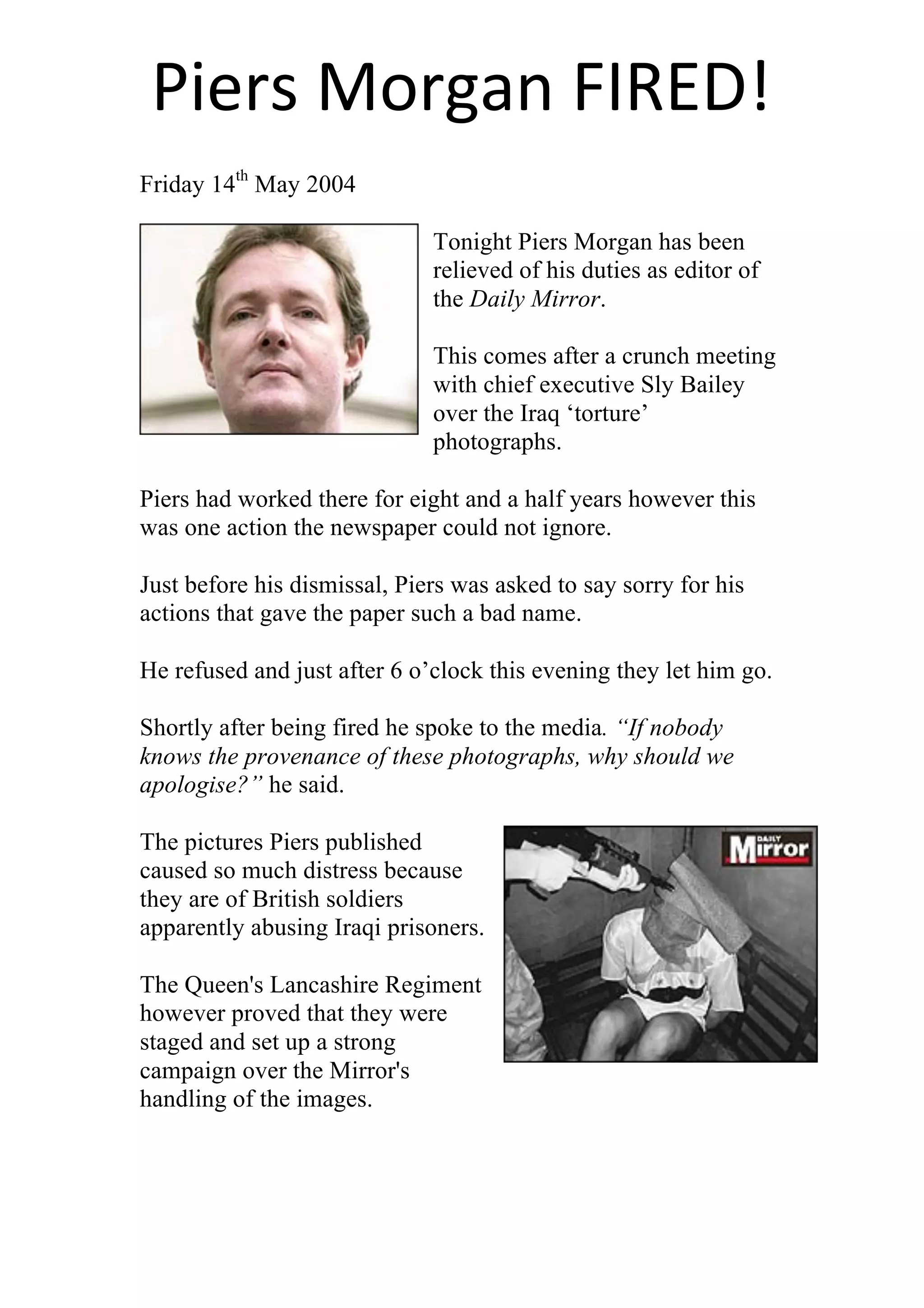 Piers Morgan was fired as editor of the Daily Mirror after refusing to apologize for publishing fake photos that purported to show British soldiers abusing Iraqi prisoners. The photos caused distress and put British troops in danger by being published. An investigation proved the photos were staged. As a result, the Mirror believed it was inappropriate for Morgan to continue as editor given the sensitive situation.