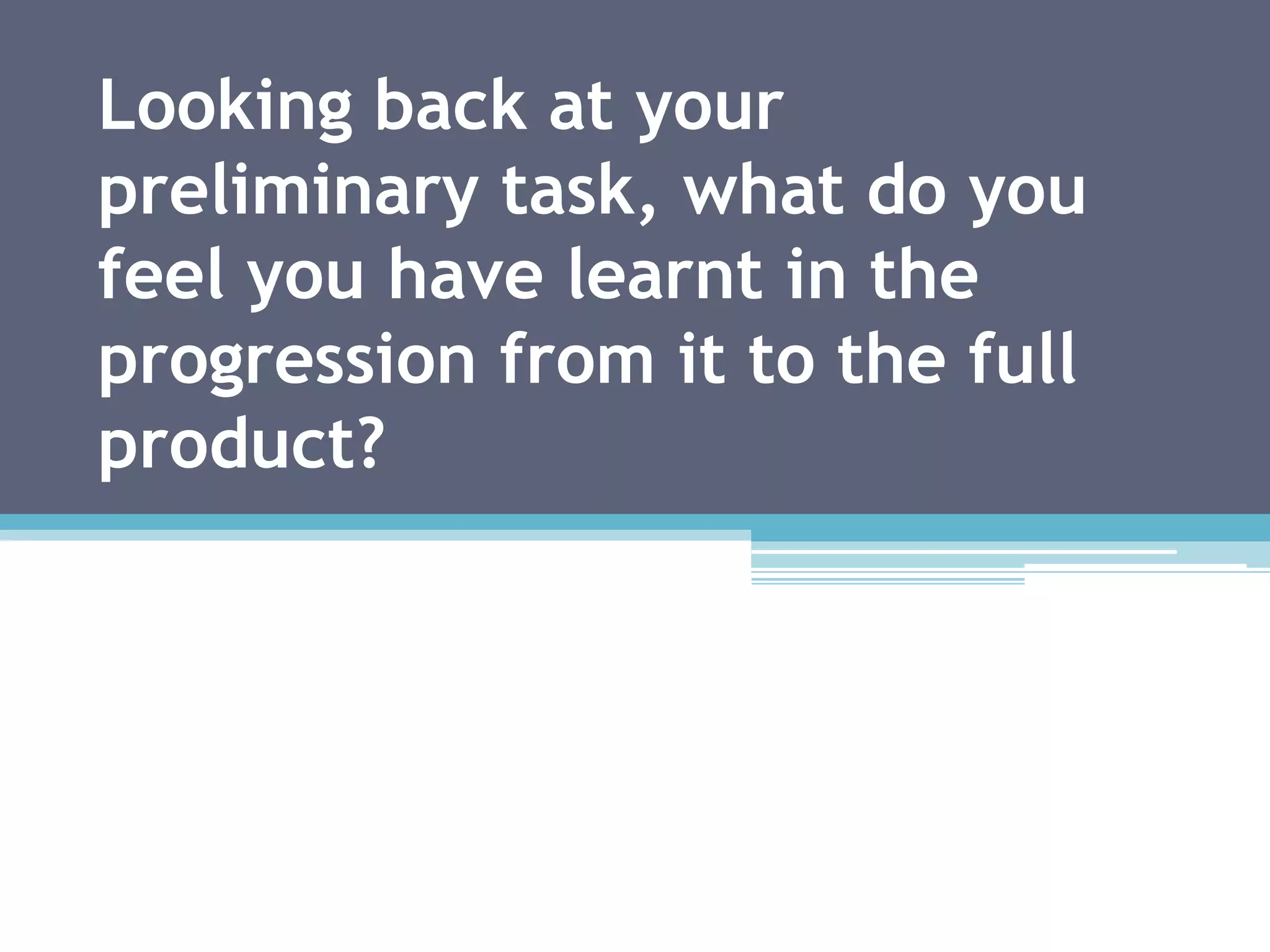 The document summarizes what the student has learned from their preliminary task to the full product. They felt their editing skills, camera work, and use of tools in Final Cut Pro advanced. The costumes, setting, and fonts used in the full product made it look more professional compared to the preliminary task. The student also provides definitions and examples of various film techniques like shot reverse shot, the 180 degree rule, rule of thirds, and different shot sizes.