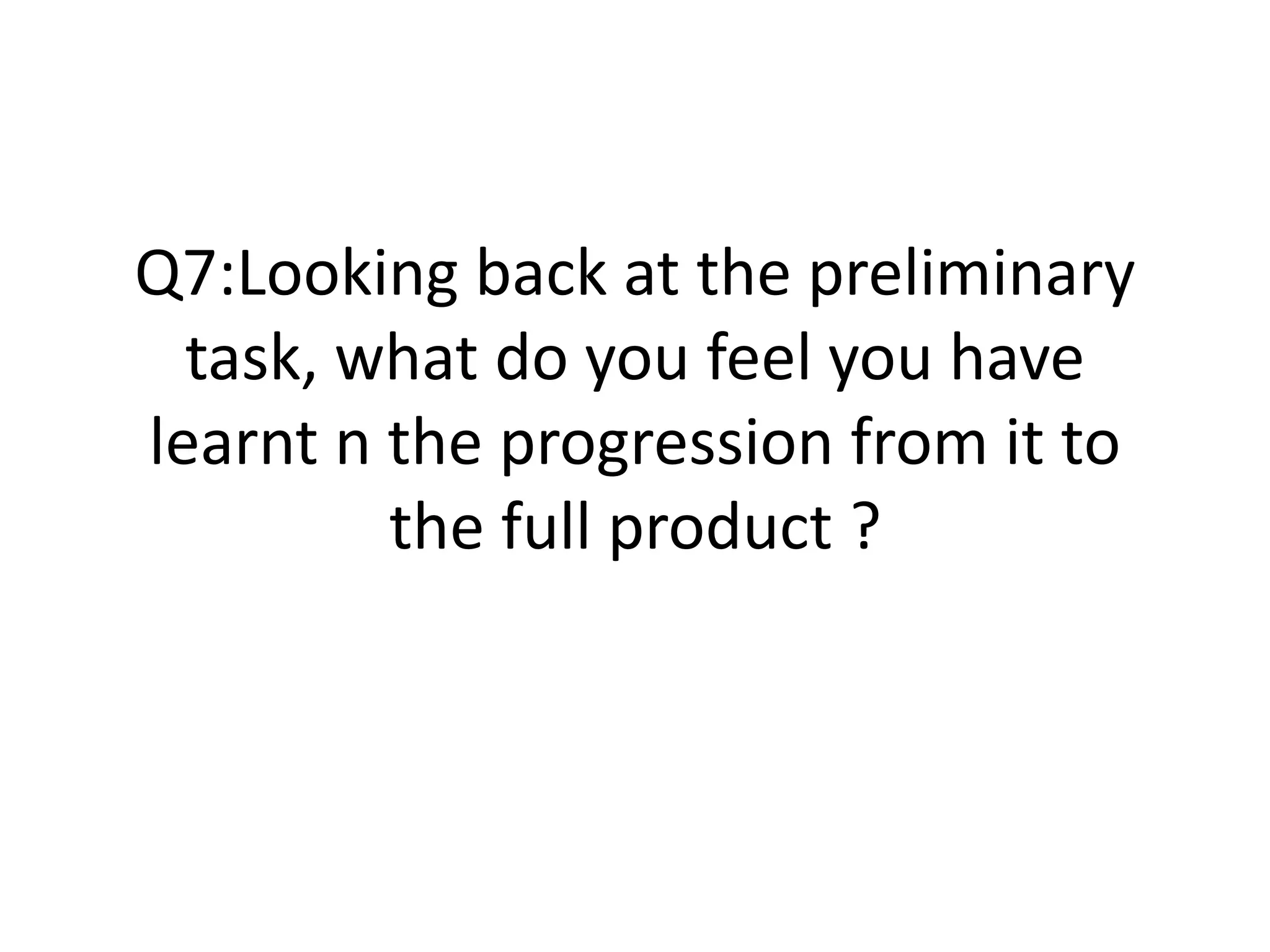 This document summarizes what was learned from creating a preliminary film task to the full opening title sequence product. It identifies issues with framing, match cuts, title credits, and acting in the preliminary task. For the full product, the group learned to improve framing by being more aware of backgrounds, properly execute match cuts, add professional title credits over moving images with credits for all, and take the acting more seriously by staying in character. Examples are provided to demonstrate improvements made from the lessons learned.