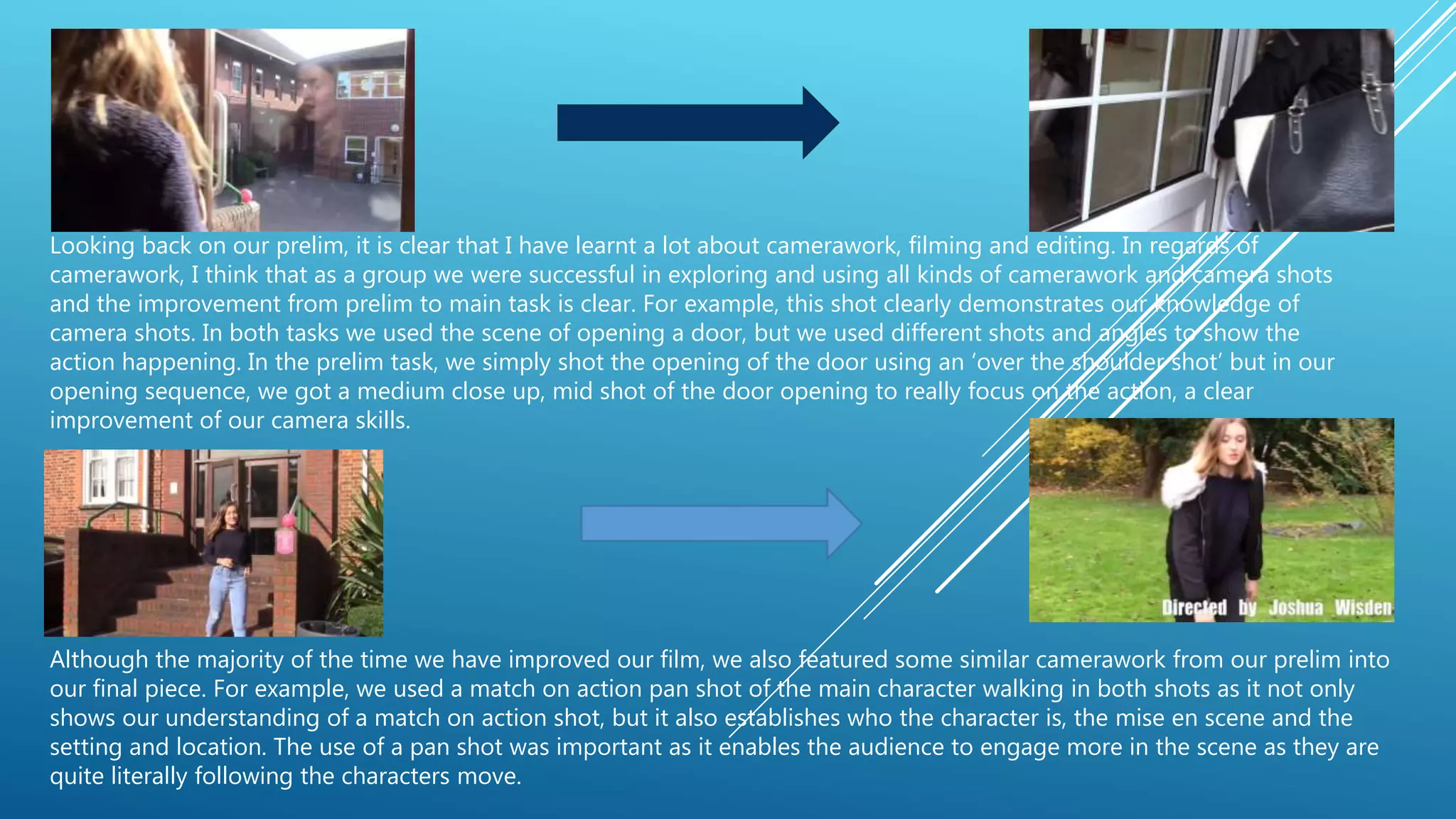 The document discusses improvements made from a preliminary film project to the main task film project. It describes how the filmmakers demonstrated better camerawork skills through more focused shots, improved use of mise-en-scene to create meaning, used lighting and props more effectively to fulfill genre conventions, chose more suitable camera angles, and greatly improved editing skills through more advanced use of effects, transitions, and sound editing. The filmmakers were able to apply lessons learned to create a stronger opening sequence that better established characters, tone, and plot.