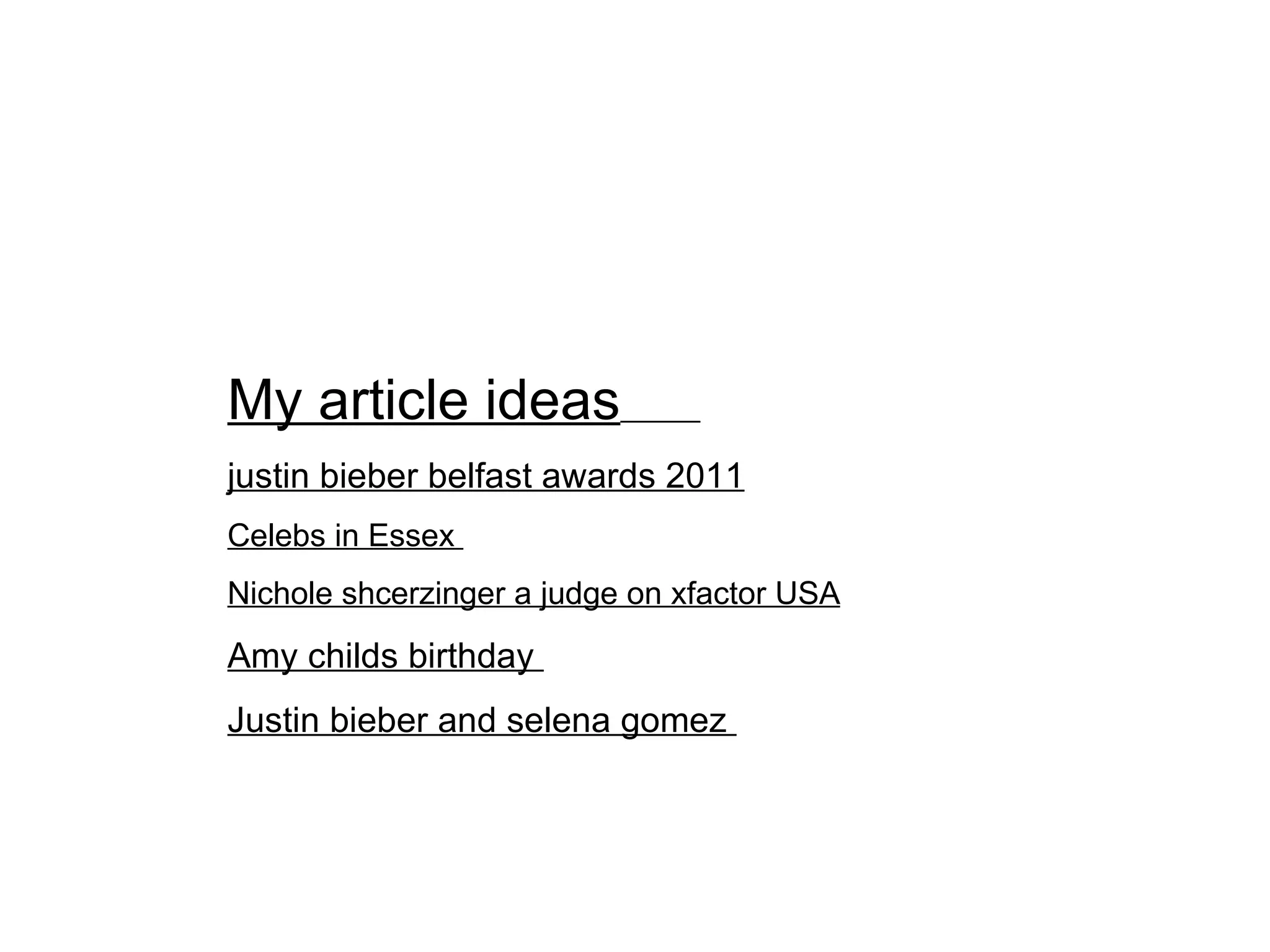 Justin Bieber won two awards at the Belfast MTV Europe Music Awards for Best Pop Act and Top Male Singer. The document also discusses Nichole Scherzinger becoming a judge on the American version of The X Factor, Amy Childs celebrating a birthday, and Justin Bieber going on a romantic vacation with Selena Gomez in Hawaii where they were affectionate in public. The document provides potential article ideas and brief summaries about celebrity events and relationships.