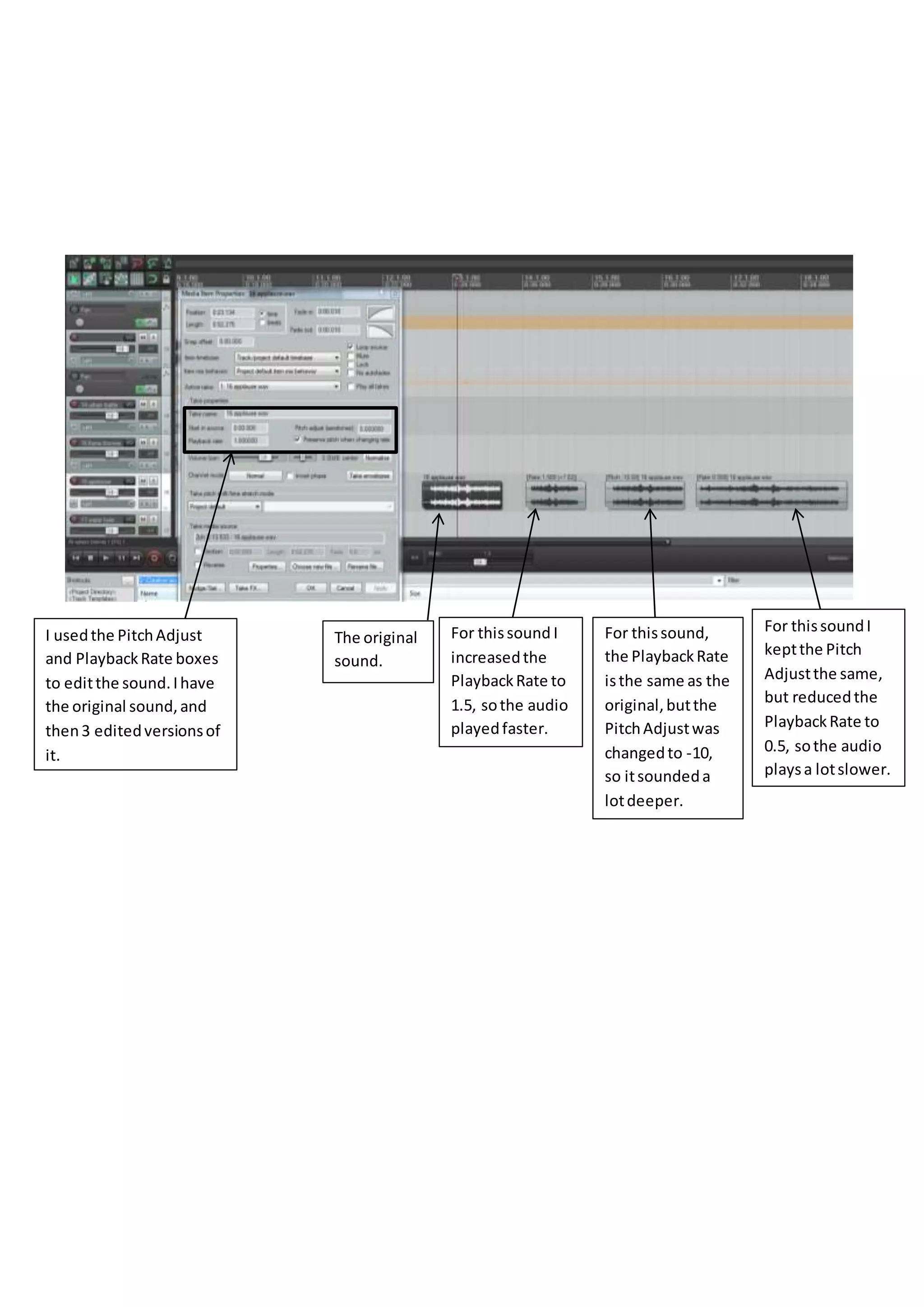 The document discusses editing an original sound file by using PitchAdjust and PlaybackRate boxes to create 3 edited versions. The first version increased the PlaybackRate to 1.5, making the audio play faster. The second version kept the same PlaybackRate but changed the PitchAdjust to -10, making the sound deeper. The third version kept the PitchAdjust the same but reduced the PlaybackRate to 0.5, making the audio play much slower.