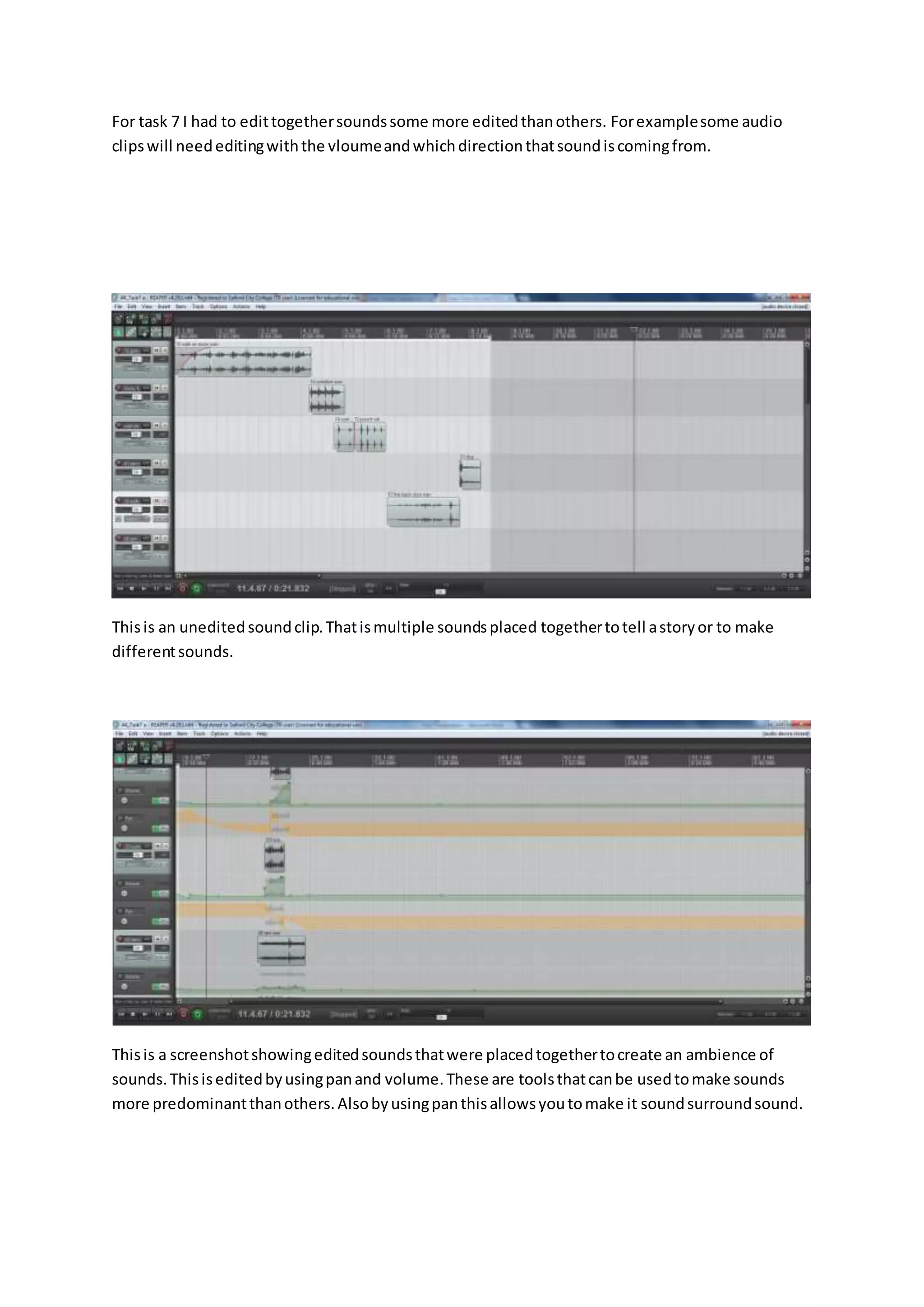 For a task, some audio clips required more editing than others, such as adjusting volume and direction. An unedited clip contained multiple sounds placed together to tell a story or create different sounds. A screenshot showed edited sounds placed together to create an ambient soundscape. Sounds were edited using pan and volume tools to make some sounds more prominent than others. Pan also allows sounds to be manipulated for surround sound. The screenshots explained how pitch and playback rate were edited for three sounds compared to one unedited sound. Virtual Studio Technology plugins were used to change sounds from their original to edited versions, transforming them into different sounds by making them louder or quieter.