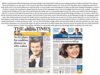 The document discusses the design of flat newspaper plans and layouts. It examines existing newspaper designs like The Times and The Guardian as inspiration. Key elements of newspaper design identified include the masthead at the top, the main story and headline in a large font, and additional featured stories. The main text is usually set in columns, which can be 4-5 columns. Images are also common and help break up the text. Captions accompany images and additional smaller images can be used within the text. Advertisements are also typically placed to attract readers.