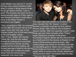 Justin Bieber surprised his girlfriend Selena Gomez with an extravagant date at the Staples Centre arena in Los Angeles. After attending a concert by Gomez's friend Demi Lovato at a nearby venue, Bieber led Gomez through an underground tunnel to the empty Staples Centre arena. There, Bieber had set up a private dinner for two from the arena's restaurant on the floor of the empty stadium. They then watched the movie Titanic on the arena's big screen, in a scene inspired by the movie Mr. Deeds. Bieber was able to secure the venue for free as a thank you for his previous sell-out concerts there.