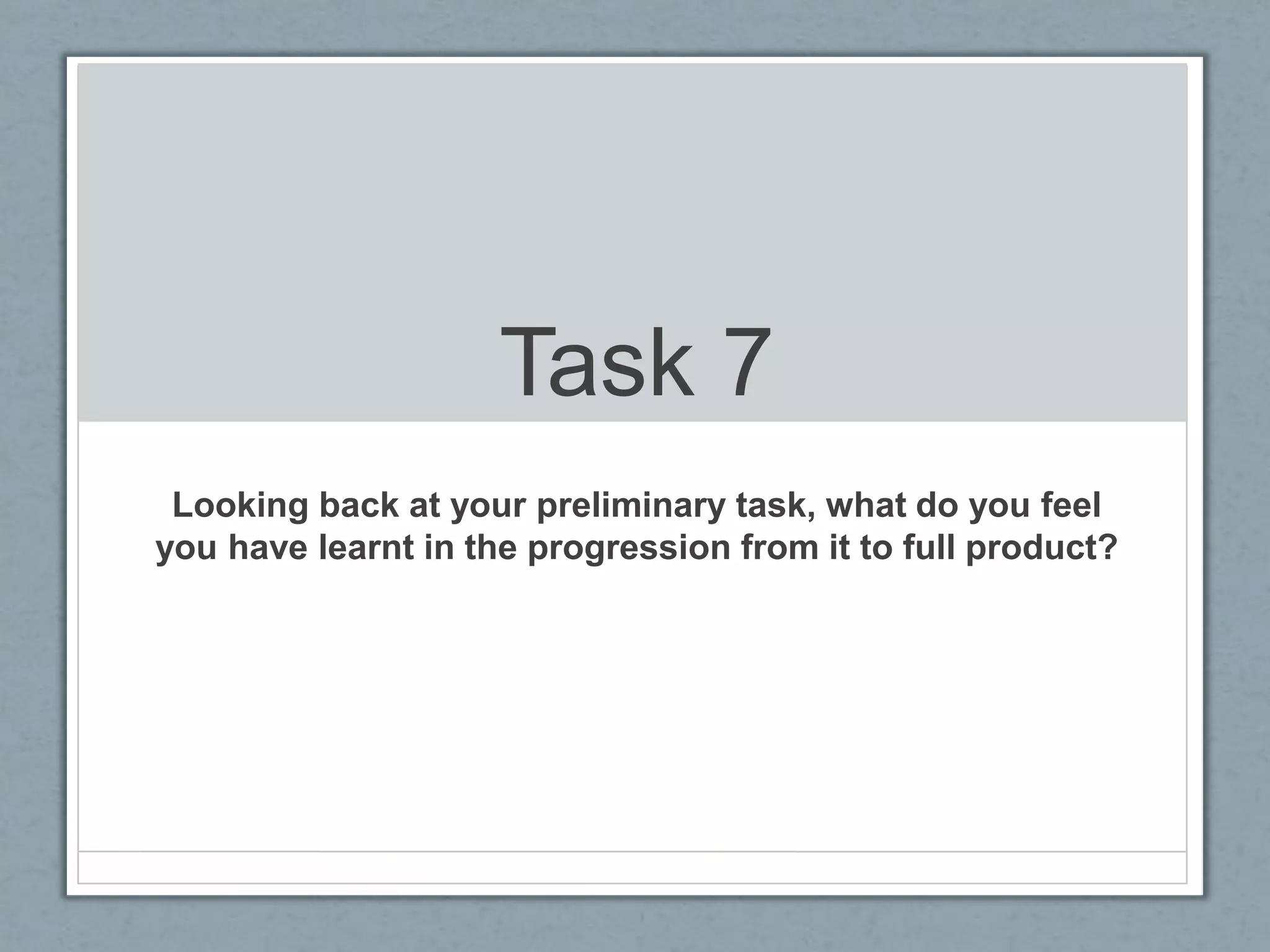 The document discusses what the author has learned from their preliminary task to their full product task. They discuss improvements in using a tripod, utilizing a variety of shots and angles to keep audiences interested and maintain continuity. Editing skills like layering clips, adding titles and color correcting improved. More focus was given to mise-en-scene elements like location, props, costumes, lighting and expressions to fit the thriller genre. Sound design was expanded to build tension. Matching shots on action was done more realistically. Research and planning was more extensive for the full product.