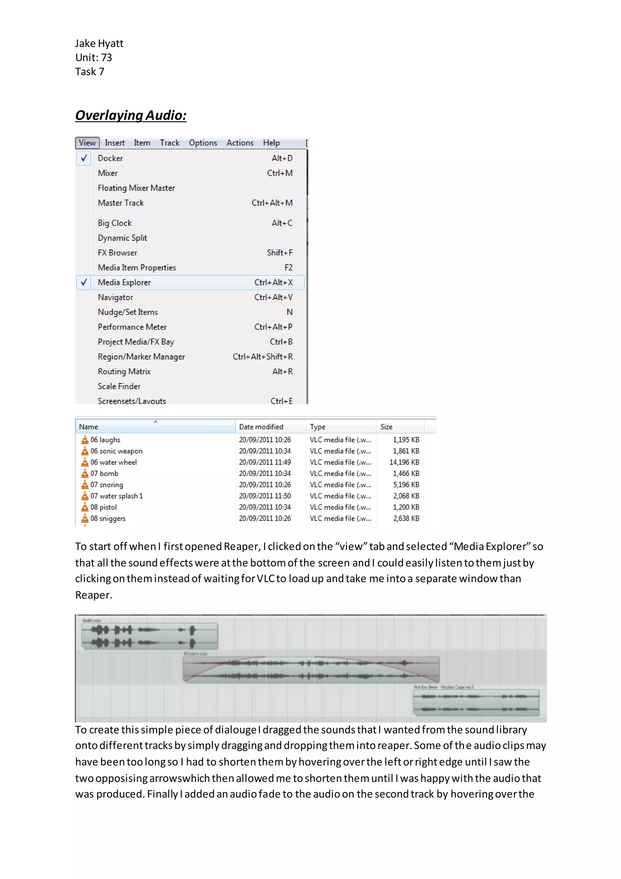 Jake Hyatt describes how to overlay audio in Reaper. He opened the Media Explorer to easily listen to sound effects without having to use a separate program. He dragged sounds from the library onto different tracks to create a dialogue. Some clips were too long, so he shortened them by adjusting the edges until the clips were the right length. Finally, he added a fade to the second track by adjusting the corners to gradually increase and decrease the volume of the audio over time.