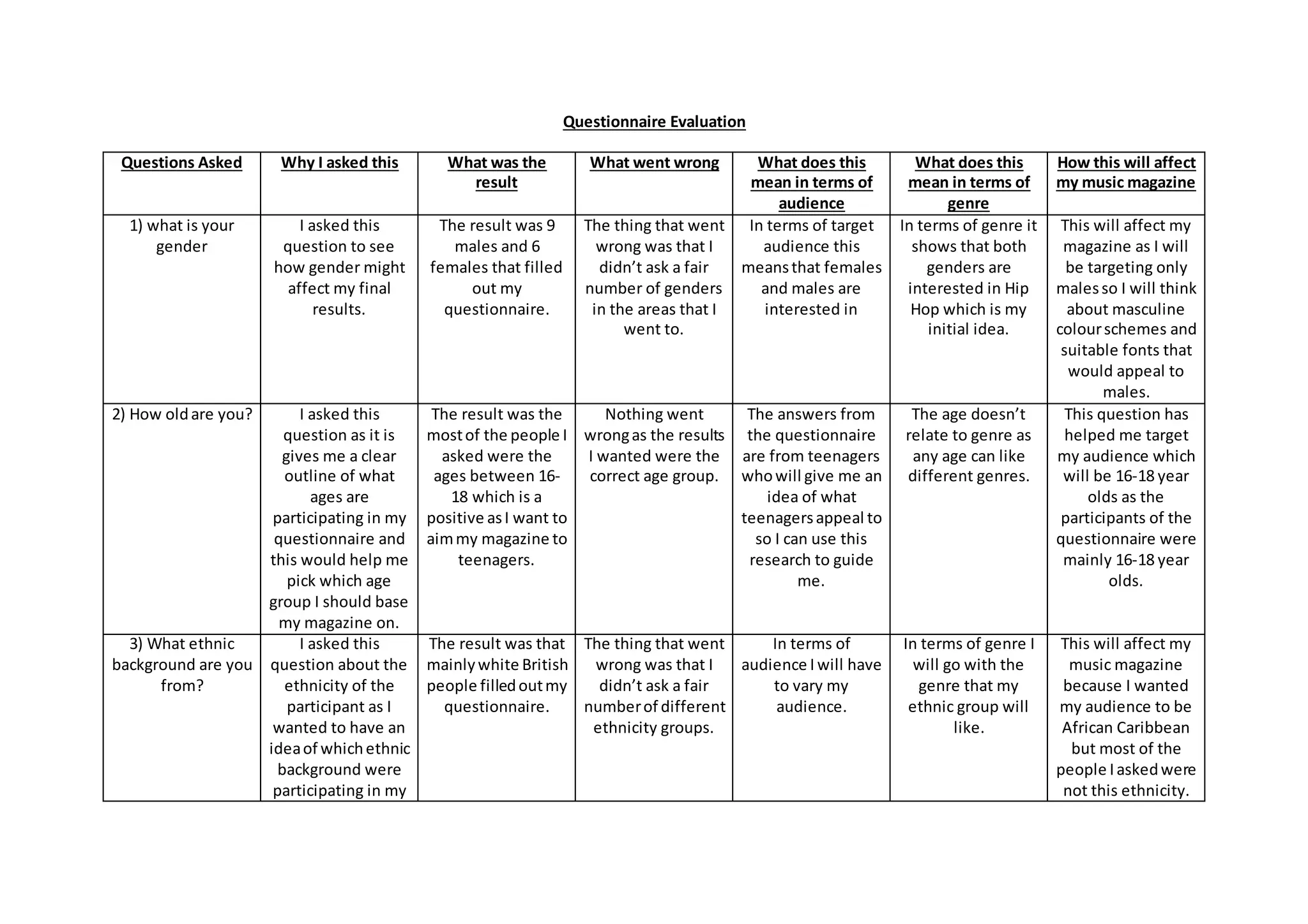 The document summarizes the results of a questionnaire given to gather information for designing a hip hop music magazine. It lists 10 questions asked, the purpose of each question, the results, what could have been improved, and how the results will influence the magazine's design. The key findings are that the target audience should be male, ages 16-18, focus on hip hop genre with artists like Drake, and have success stories and Q&A style articles. Colors black, red and white and a layout that is not too simple but uses all areas of the page are recommended.