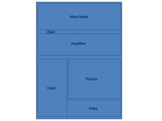 This document discusses the process of designing tabloid newspaper front pages to accompany a story. The author created 4 designs for the front page of "The Sun" tabloid, experimenting with layout, fonts, inclusion of additional stories, and styling to mimic older newspapers. For the final design, the author aged the appearance by adding an old paper texture and reducing opacity on text and images to look worn from printing years ago. The goal was to realistically portray what the front page may have looked like if the story was published at the actual time of the events.
