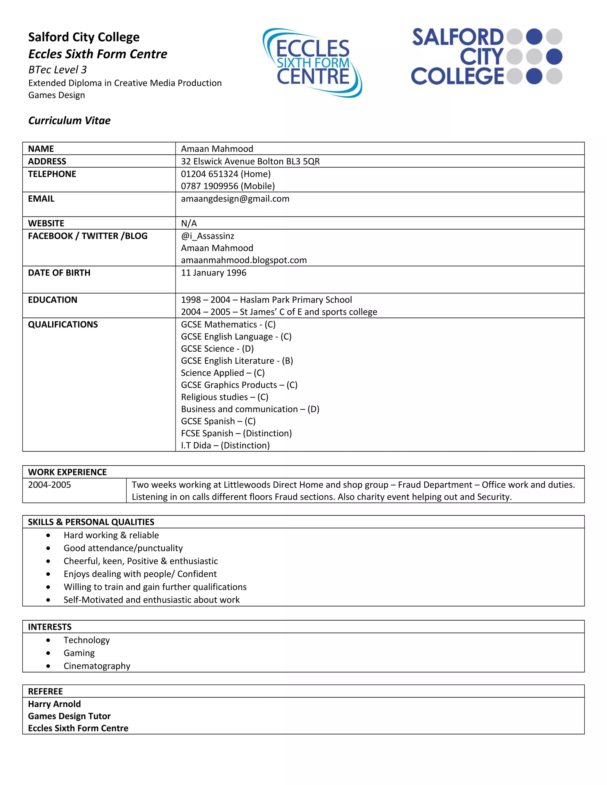 This curriculum vitae is for Amaan Mahmood, who is applying for the Extended Diploma in Creative Media Production in Games Design at Salford City College. He has a variety of GCSE qualifications including grades C or higher in Math, English Language, English Literature, and Graphics Products. His work experience includes two weeks at Littlewoods Direct in their fraud department. He is hard working, reliable, and enthusiastic with interests in technology, gaming, and cinematography. His referee is Harry Arnold, his Games Design tutor at Eccles Sixth Form Centre. In his personal statement, Amaan discusses his lifelong passion for video games and desire to pursue games design, citing influences like Naughty Dog developers.