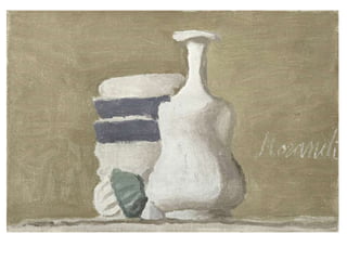 Morandi was an Italian painter known for his still life works and subtle tonal paintings often depicting simple everyday objects like vases, bottles, and bowls. The lesson introduces students to Morandi's style with the objective of having them produce their own tonal ink drawings of arranged still life items in his manner of working from light to dark tones.