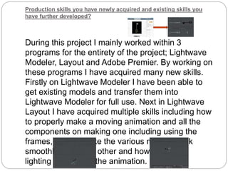 This document summarizes Callum Deighton's work on a project using Lightwave Modeler, Layout, and Adobe Premier. He acquired new skills in modeling, animation, lighting, and video editing. While his final animation differed from his original idea of a swordfighter due to issues animating the full body model, he was still able to depict someone fighting with a sword. Feedback noted the animation was well-made but textures and background could have been improved. Going forward, he would focus on usable models and spend more time on backgrounds and textures to improve visual quality.
