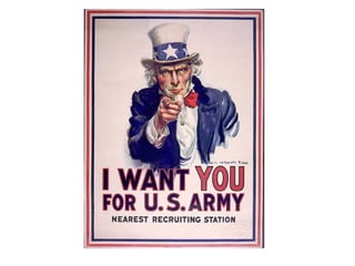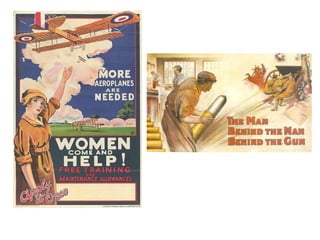 The document summarizes how the American homefront was impacted during World War 1. It discusses how the government instituted policies like the draft and propaganda to enforce loyalty. Agencies were created to oversee war production, financing, and labor disputes. Women entered the workforce in greater numbers while immigration declined. Roles changed as blacks and Hispanics took new industrial jobs and children participated in patriotic youth groups.