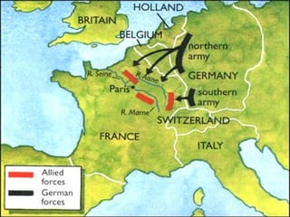The document summarizes major events from 1914 to 1918 during World War 1. It describes the assassination of Archduke Franz Ferdinand which sparked the war. Key battles and events on the Western and Eastern fronts are mentioned, including the use of chemical weapons at Ypres in 1915 and the long, costly battles of Verdun and the Somme in 1916. American entry into the war in 1917 and Germany's resumption of unrestricted submarine warfare are noted. The document concludes with the Allied counteroffensives in 1918 and the signing of the Armistice on November 11, 1918, ending the war.
