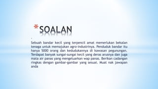 Dokumen ini membincangkan keperluan bekalan tenaga untuk sebuah bandar kecil dengan populasi 5000 orang yang terletak di kawasan pegunungan. Tiga cadangan sumber tenaga yang sesuai adalah tenaga solar, geoterma, dan hidroelektrik, memanfaatkan cahaya matahari, haba bawah permukaan bumi, dan sungai-sungai yang deras. Cadangan ini bertujuan untuk menjana kuasa elektrik dan memajukan agro-industri di bandar tersebut.
