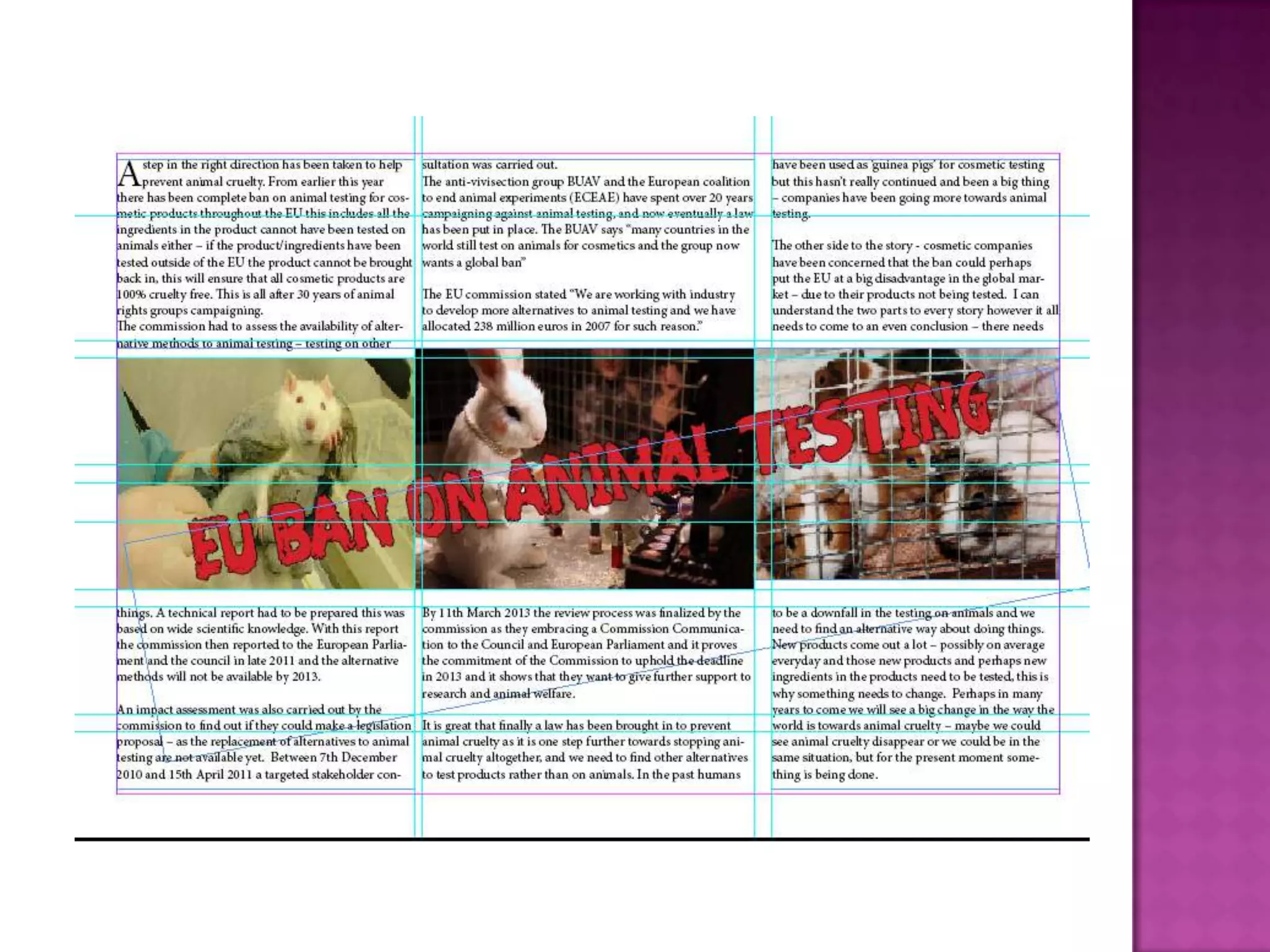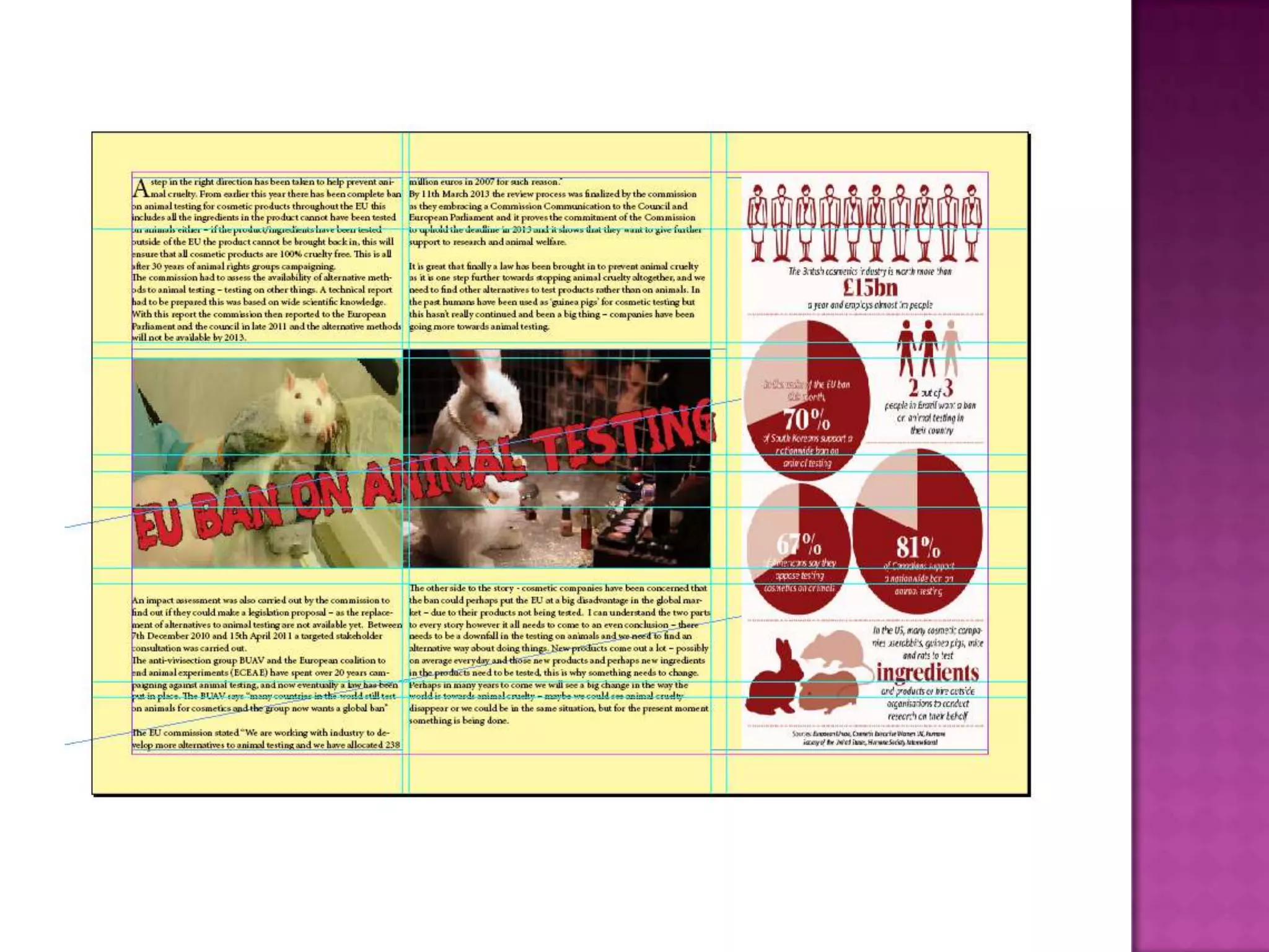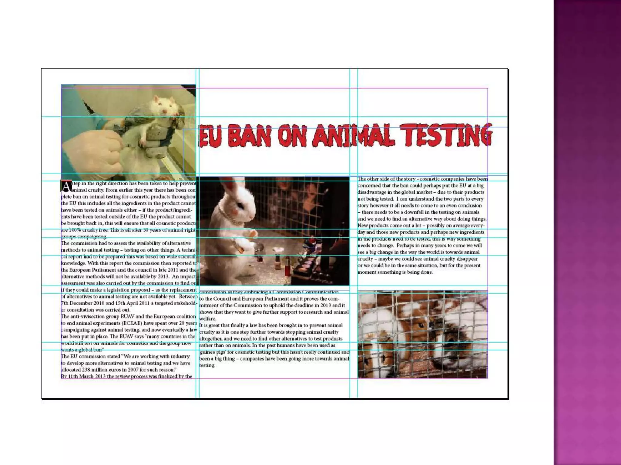 The document discusses the process of designing a layout for a fanzine about banning animal testing. The author experimented with different layouts, initially placing images far apart with text around them and a headline at the top. This looked too plain. The author then placed images across the middle of the page with the headline going through them, to make the headline more noticeable. Additional changes included adding a larger informational image and background color. The final design still needs improvements to make it more eye-catching for readers.