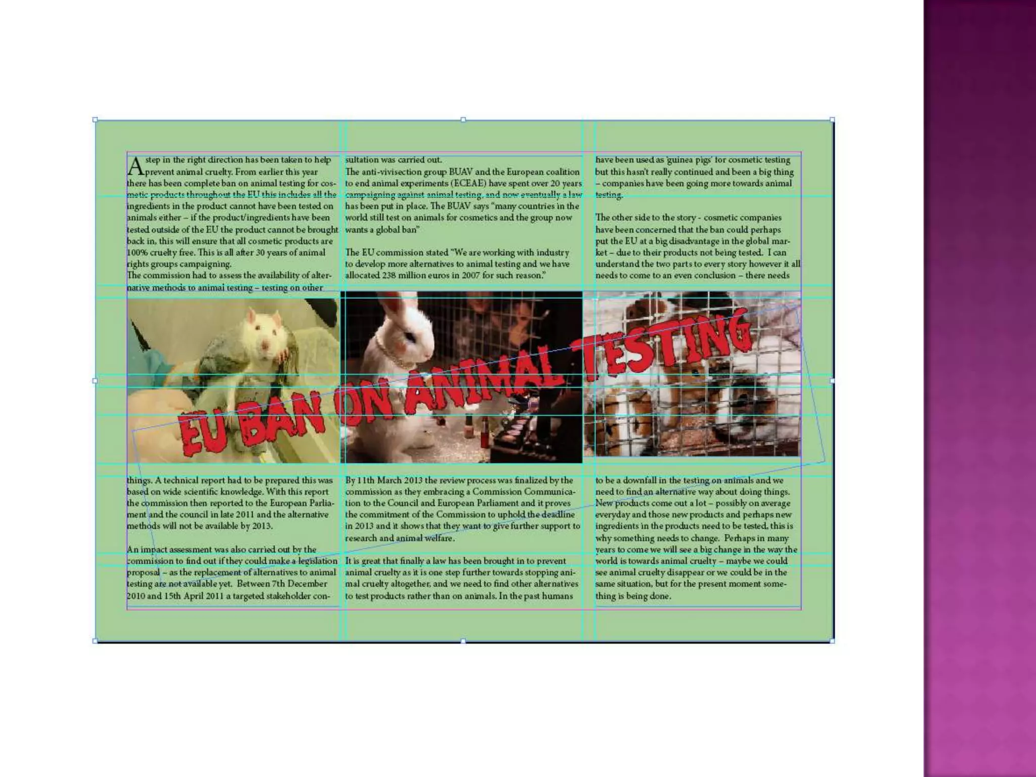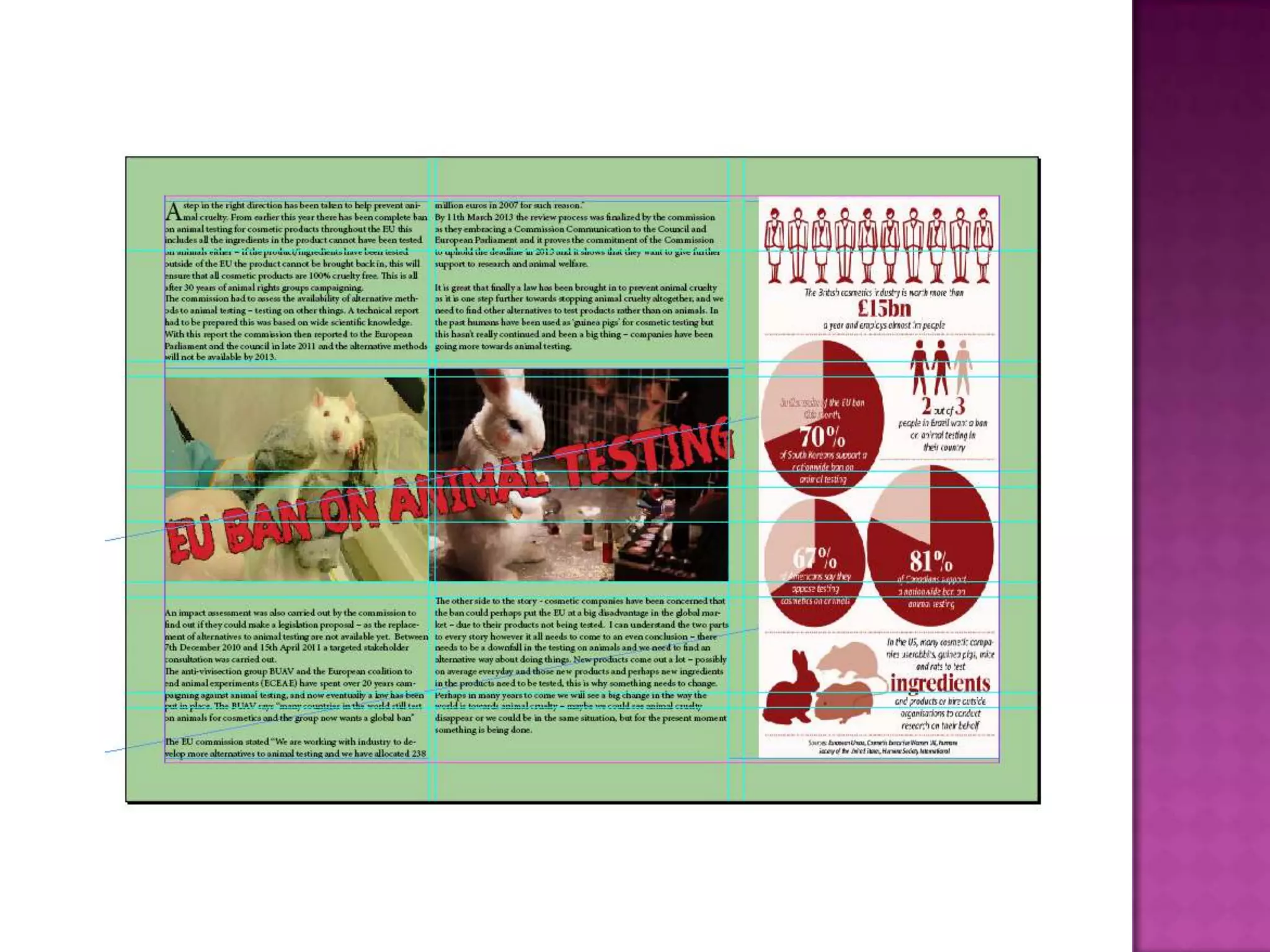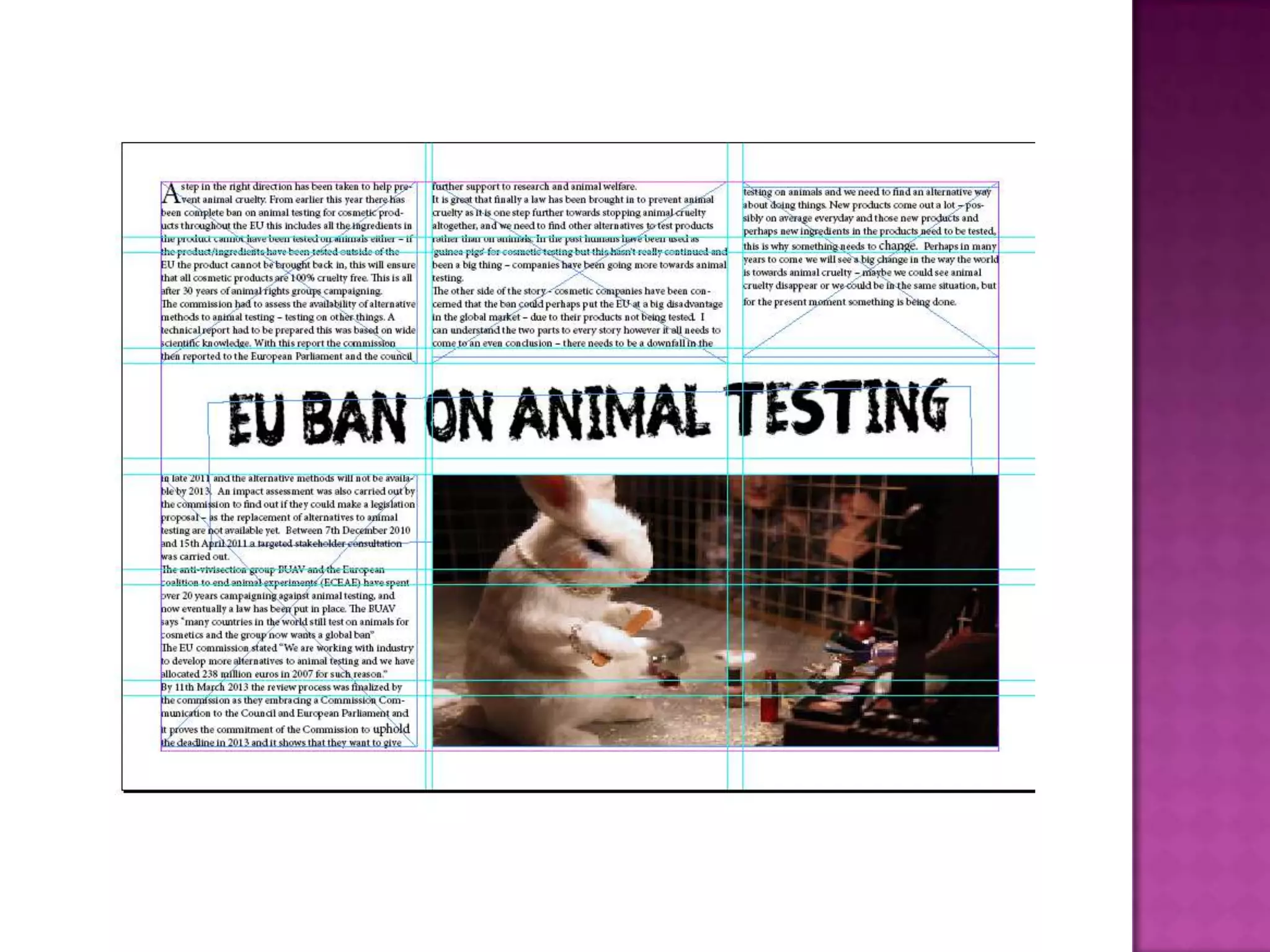 The document discusses the process of designing a layout for a fanzine about banning animal testing. The author experimented with different layouts, initially placing images far apart with text around them and a headline at the top. This looked too plain. The author then placed images across the middle of the page with the headline going through them, to make the headline more noticeable. Additional changes included adding a larger informational image and background color. The final design still needs improvements to make it more eye-catching for readers.