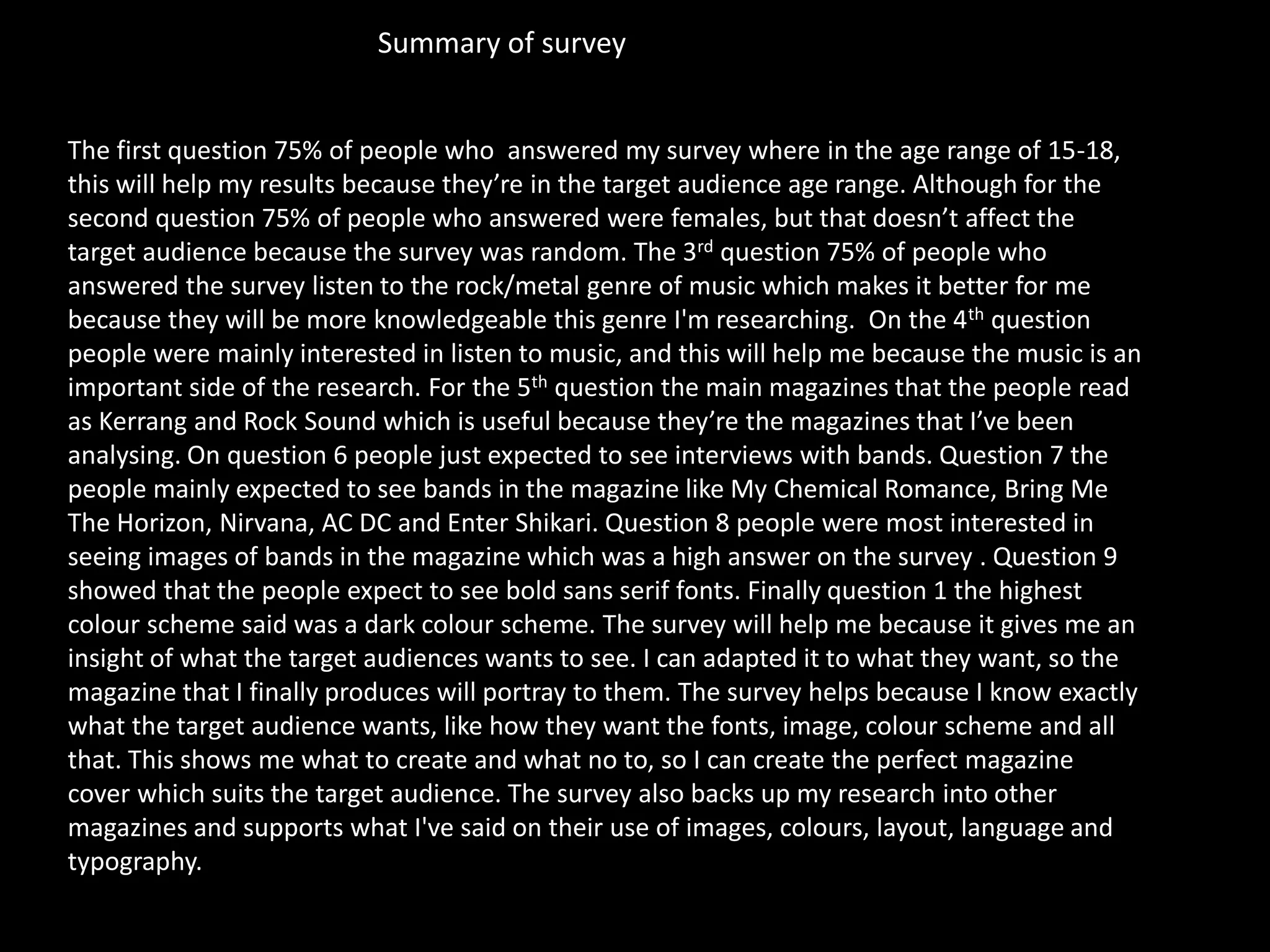 The survey results will help the author design a magazine for their target audience. 75% of respondents were ages 15-17, which matches the target age range. 75% also listened to rock/metal music and read magazines like Kerrang and Rock Sound. Respondents wanted to see interviews with bands, photos of bands like My Chemical Romance and Nirvana, and a dark color scheme. The survey provides useful insights into what the target audience wants to see in a magazine about rock/metal music.