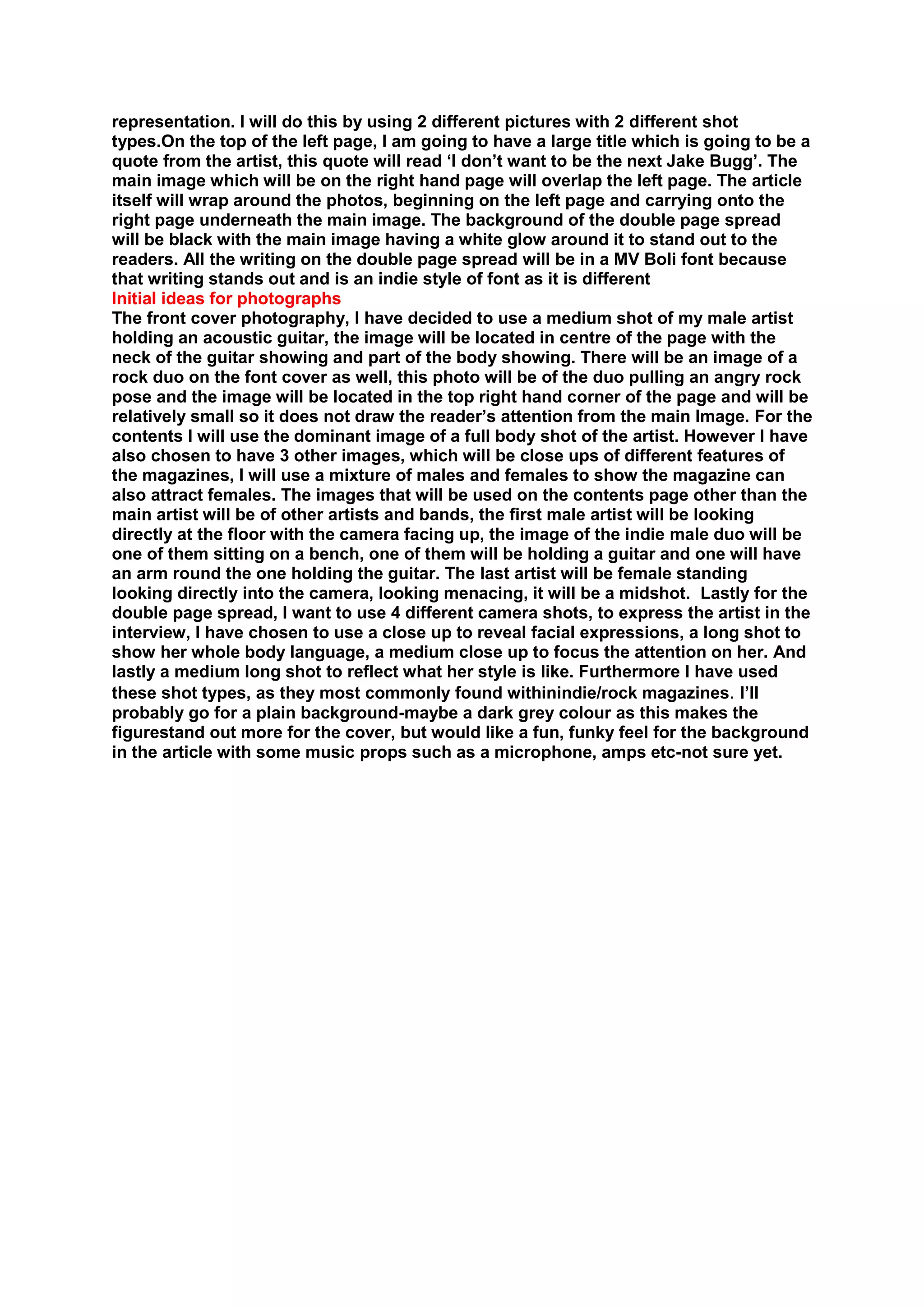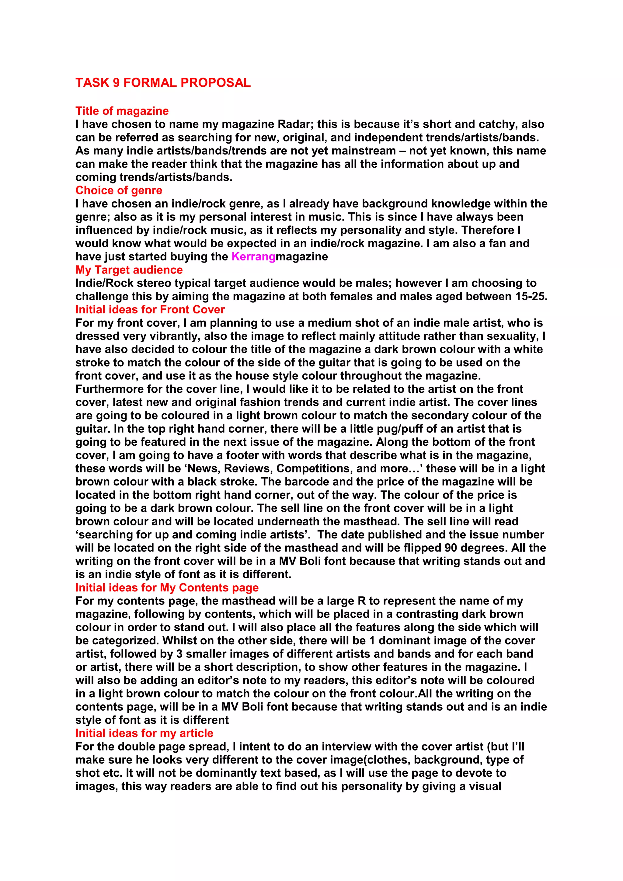 The document provides initial ideas for the proposed indie/rock magazine titled "Radar". It outlines plans for the front cover featuring a medium shot of an indie male artist holding a guitar. The contents page would include a large "R" masthead along with images and short descriptions of featured artists. A double page article interview would use different photos of the cover artist to convey personality without being text-heavy. Photographs throughout would portray various artists in styles commonly found in indie magazines.