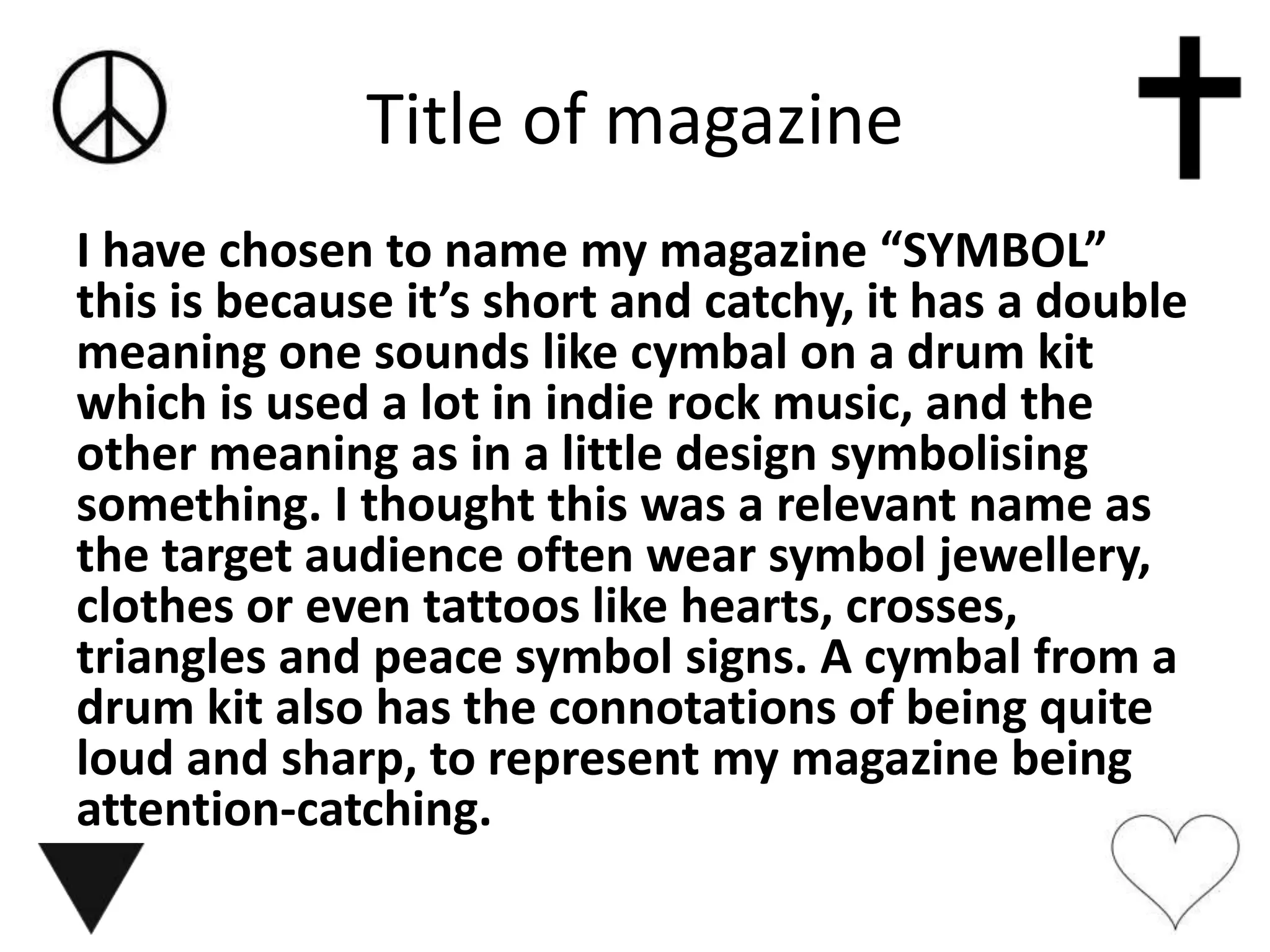 This document proposes a magazine called "SYMBOL" targeting indie rock fans aged 16-30, both male and female. It will feature a female model on the cover to attract both genders. The contents page will showcase images of artists and bands. A double-page spread will include an interview with an artist or band, divided into columns alongside their images. Photographs on the cover, contents page, and double-page spread will feature a variety of male and female indie rock artists.