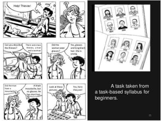 The document discusses Task-Based Language Teaching (TBLT), outlining its historical background, key definitions, and principles. TBLT focuses on using meaningful tasks to facilitate second language acquisition by engaging students effectively and encouraging natural language use. The approach emphasizes that learning occurs best when students are motivated and able to interact in meaningful contexts, supporting their development in a second language.