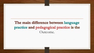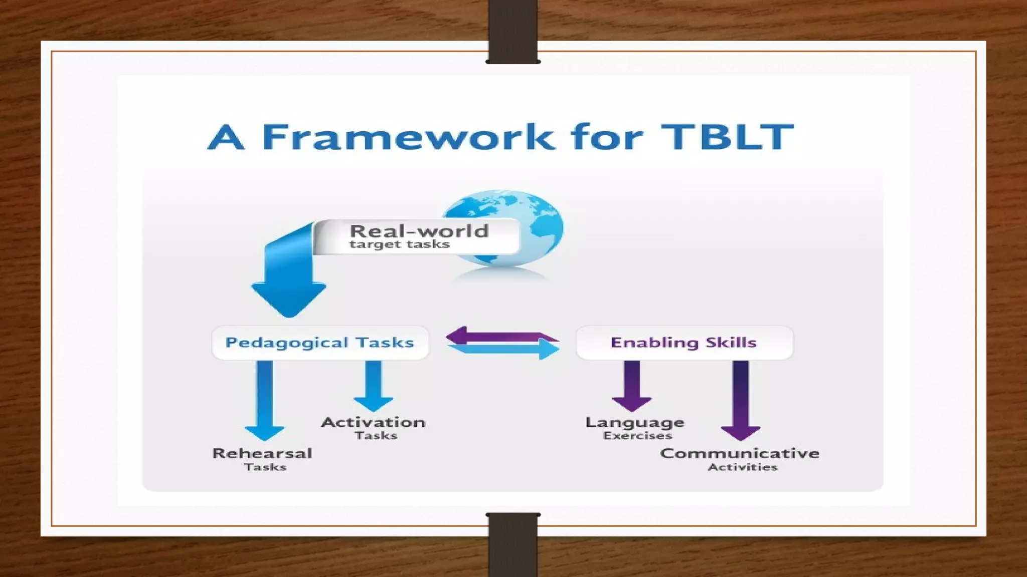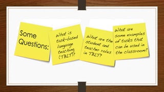 Task-based language teaching (TBLT) is an approach that uses tasks as the core unit of planning and instruction. It is presented as a development of communicative language teaching. TBLT focuses on having students complete meaningful tasks using the target language. A task is any activity that requires students to use language to arrive at an outcome, focusing on meaning over form. Proponents of TBLT argue that it engages students and provides contexts for language development, while critics note that early-stage learners may benefit from more focus on form. Effective TBLT involves scaffolding tasks, recycling language, and integrating form, function and meaning.