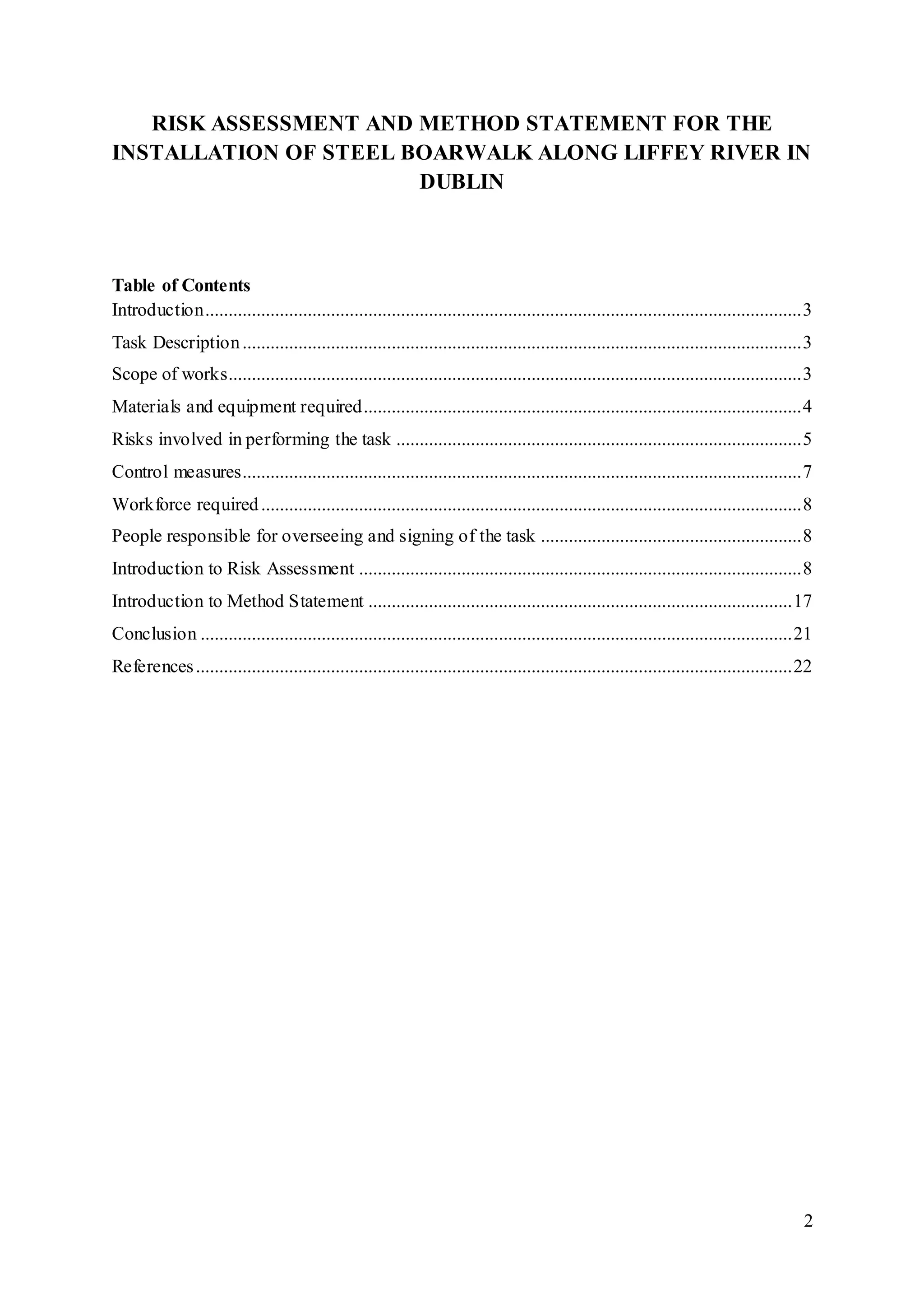 This document provides a risk assessment and method statement for installing a steel boardwalk along the Liffey River in Dublin. It identifies major risks such as falling, drowning, equipment hazards, and outlines control measures. The workforce of 6 includes a foreman, welder, operatives, and crane operator. Installation will involve demolishing an existing wall, lifting steel sections, and working at the river's edge where harnesses and life jackets are required.