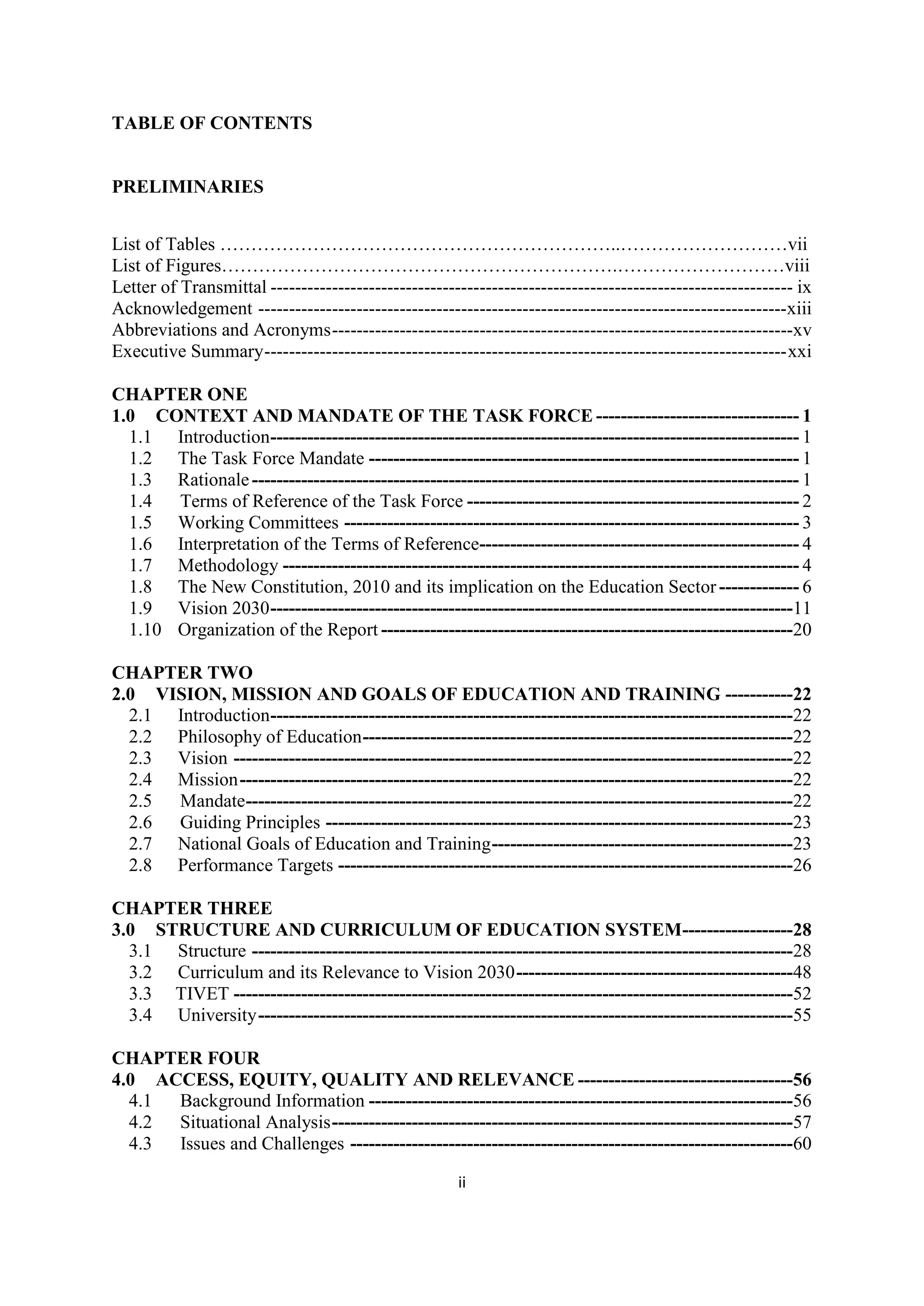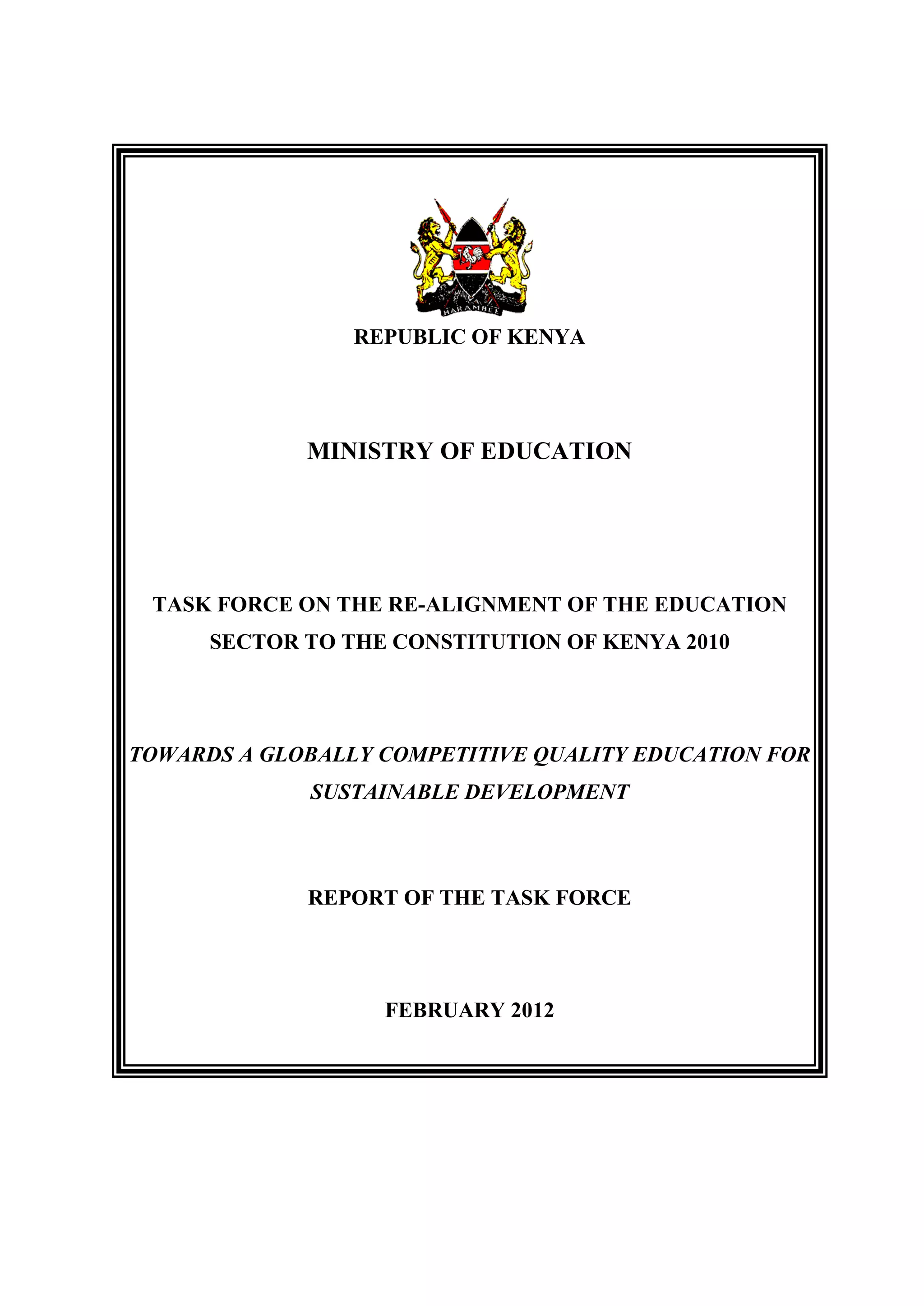 The document is a report by the Task Force on the re-alignment of the education sector in Kenya to the 2010 Constitution and Vision 2030, detailing the mandate, methodology, and findings from extensive consultations with stakeholders. It addresses critical issues such as access, equity, quality, governance, and management of education in the context of devolved government structures. The report culminates in recommendations aimed at enhancing the educational landscape for sustainable development and competitiveness.
