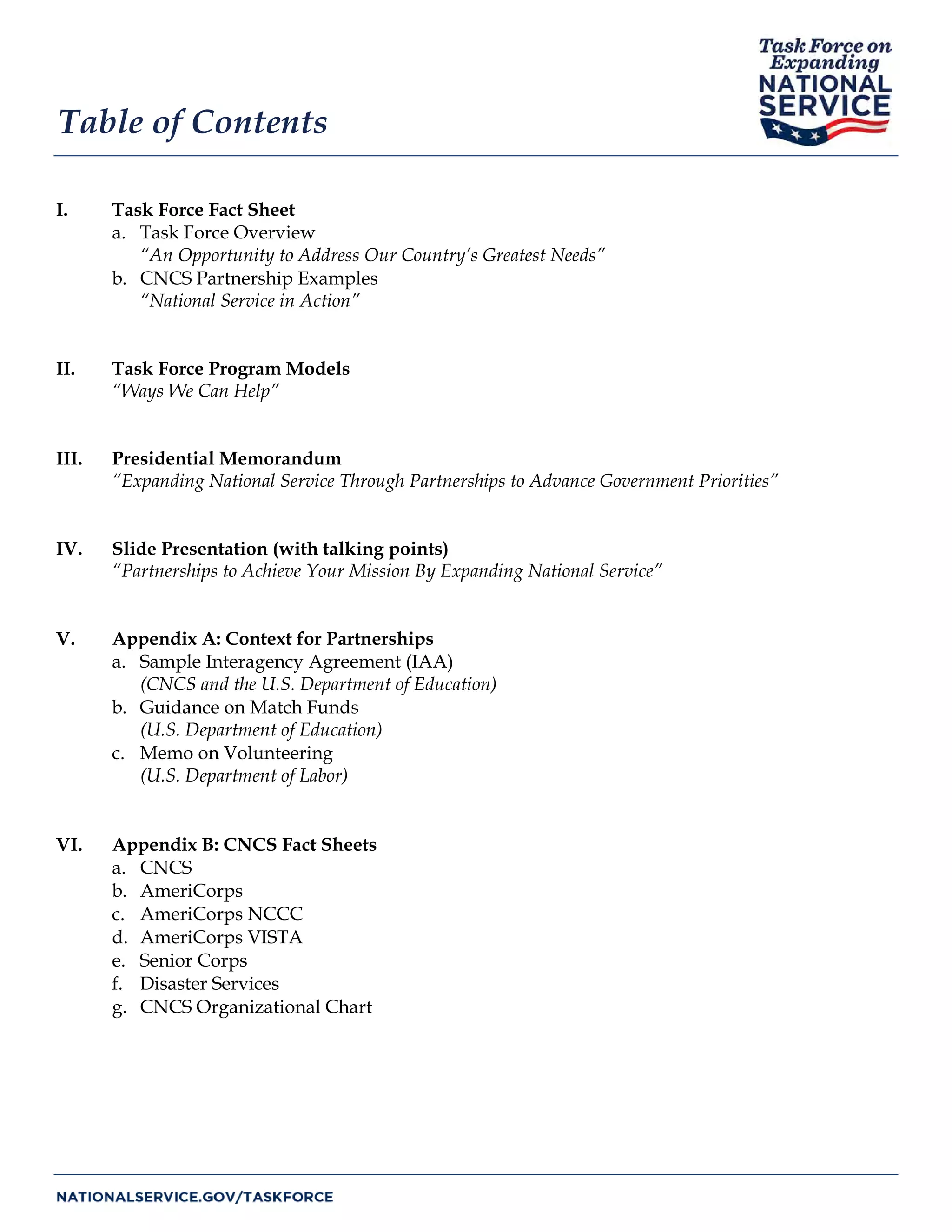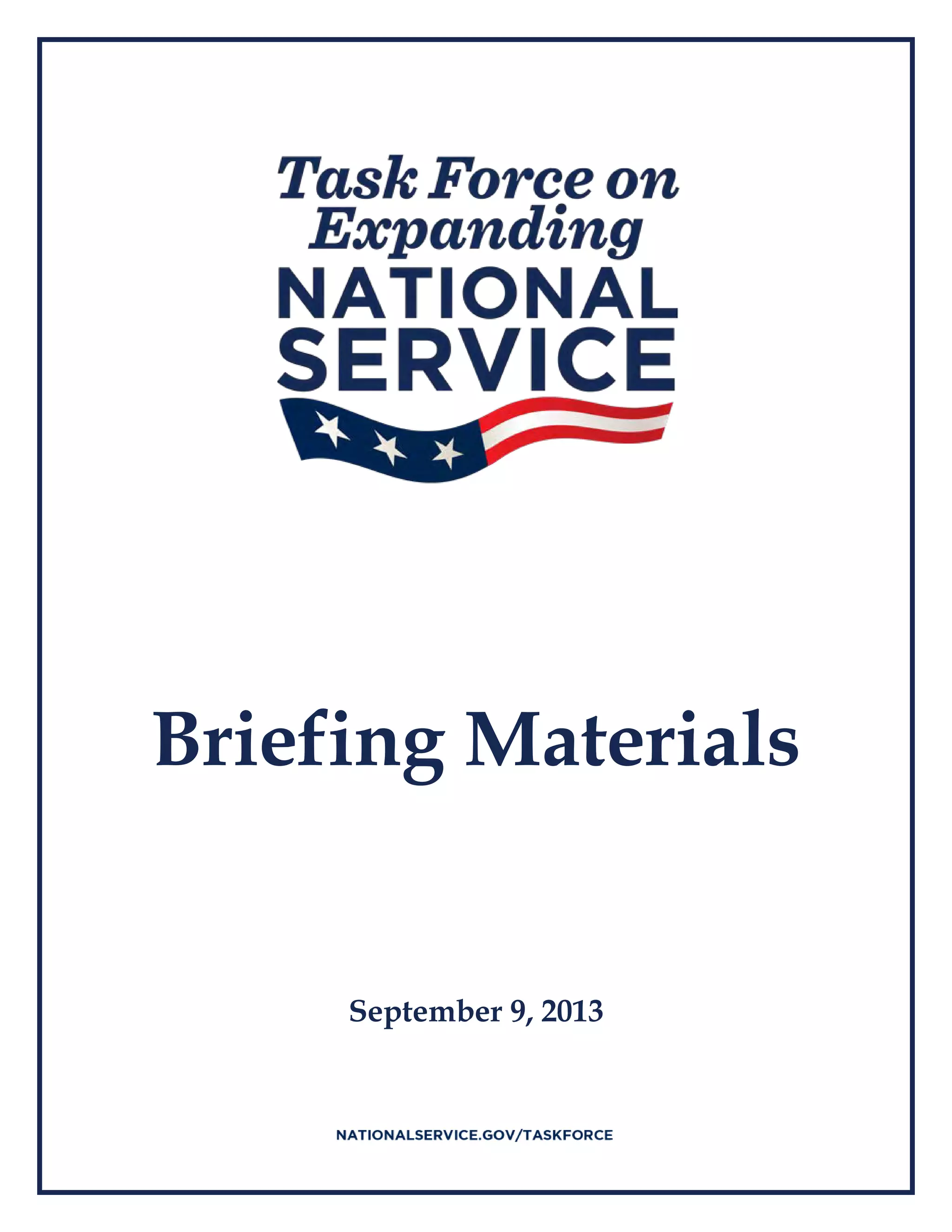 The document provides briefing materials for a Task Force on Expanding National Service, including an overview of the Task Force, examples of existing CNCS partnerships, potential program models for partnerships, and background information on CNCS. The Task Force was established by Presidential Memorandum to advance federal agency and administration priorities through expanding national service opportunities. It will identify strategies to create new partnerships between federal agencies and CNCS to engage more Americans in national service and address important national needs.