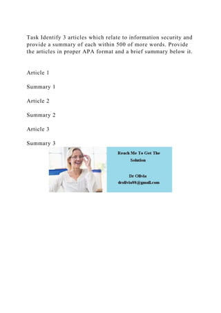 The document outlines a task to identify three articles related to information security and requires a summary of each article in 500 words or more. It specifies that the articles should be cited in APA format, with each summary to follow its respective article citation. The output should consist of article summaries labeled as 'article 1 summary,' 'article 2 summary,' and 'article 3 summary.'
