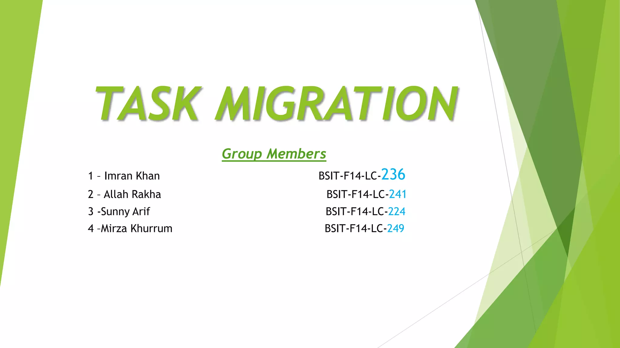 This document discusses task migration in distributed systems. It defines task migration as the preemptive transfer of a partially executed task to another node. The document outlines the group members working on the task migration project and provides an introduction to terminology used. It then discusses reasons for task migration like load distribution and improving communication. The main issues discussed are state transfer costs, location transparency, migration mechanism structure, and performance impacts.