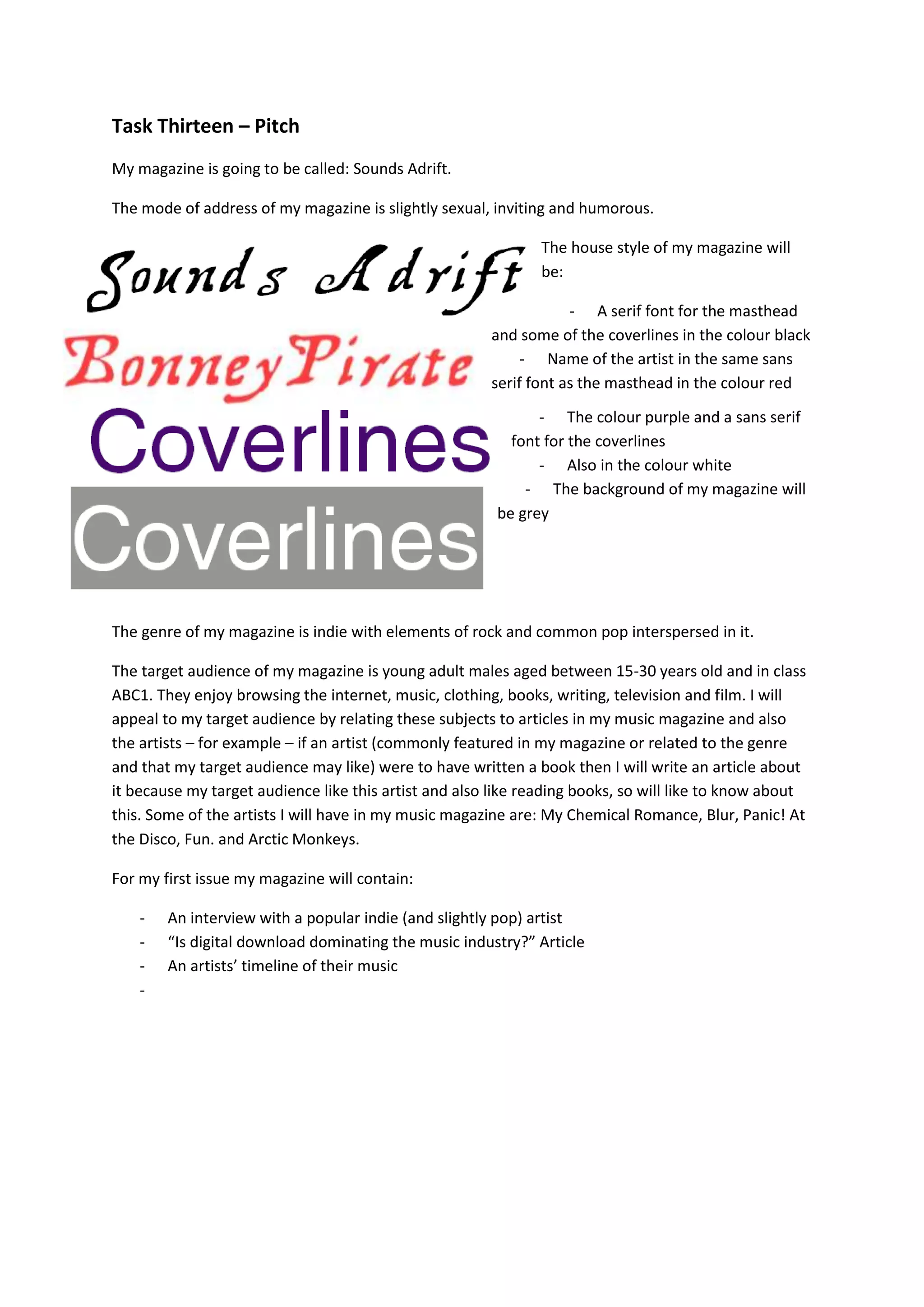 The magazine is called "Sounds Adrift" and targets young adult males aged 15-30 from socioeconomic classes ABC1. It will have a slightly humorous tone and focus on indie and rock music. The first issue will include an interview with an indie/pop artist, an article on the dominance of digital music downloads, and an artist timeline. It aims to appeal to readers' interests in music, clothing, books, TV and film.