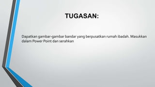 Dokumen ini berisi daftar beberapa bandar yang berpusatkan rumah ibadah seperti Mekah dan Madinah untuk Islam, Angkor Wat dan Akshardam untuk Hindu, serta Vatican City dan Milan Catherdral untuk Kristian.