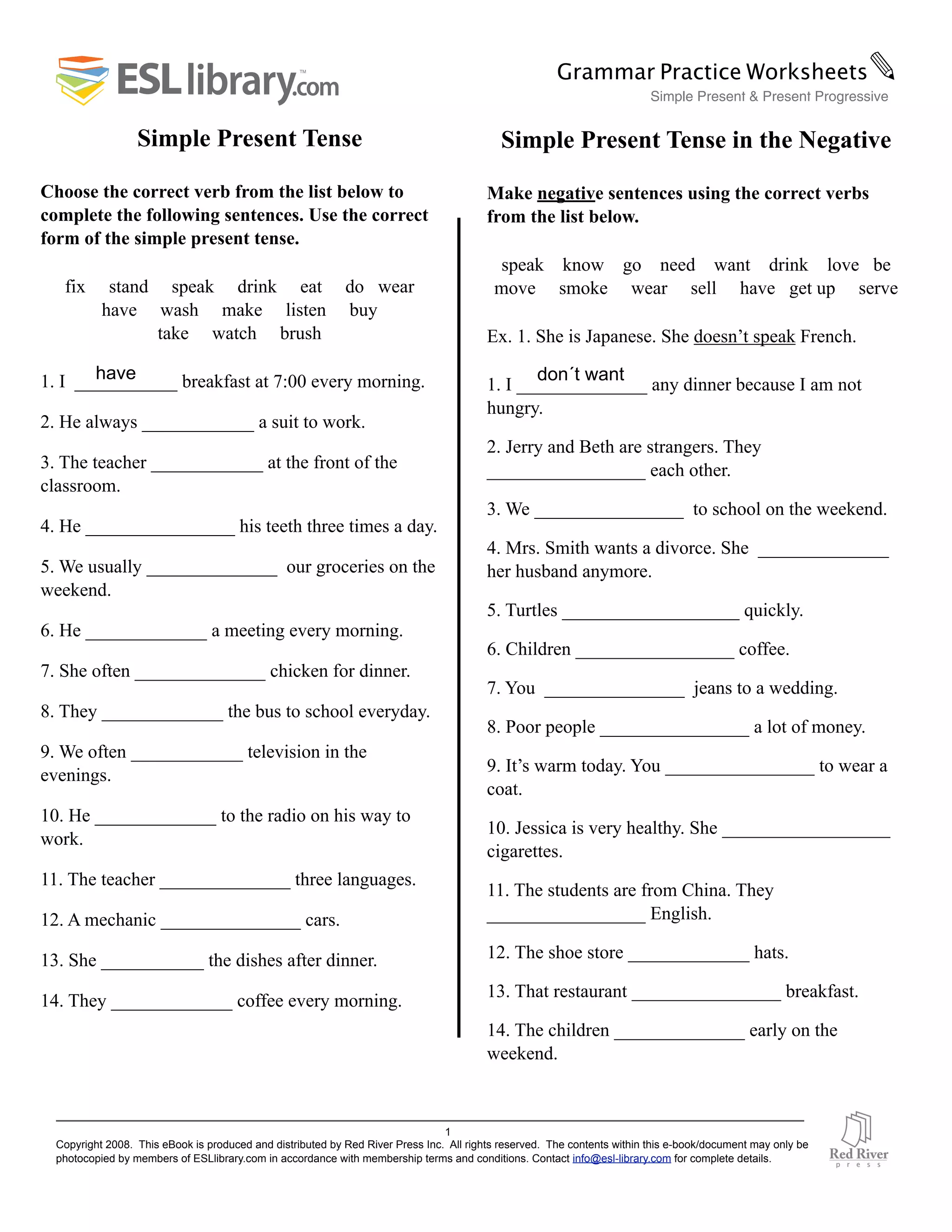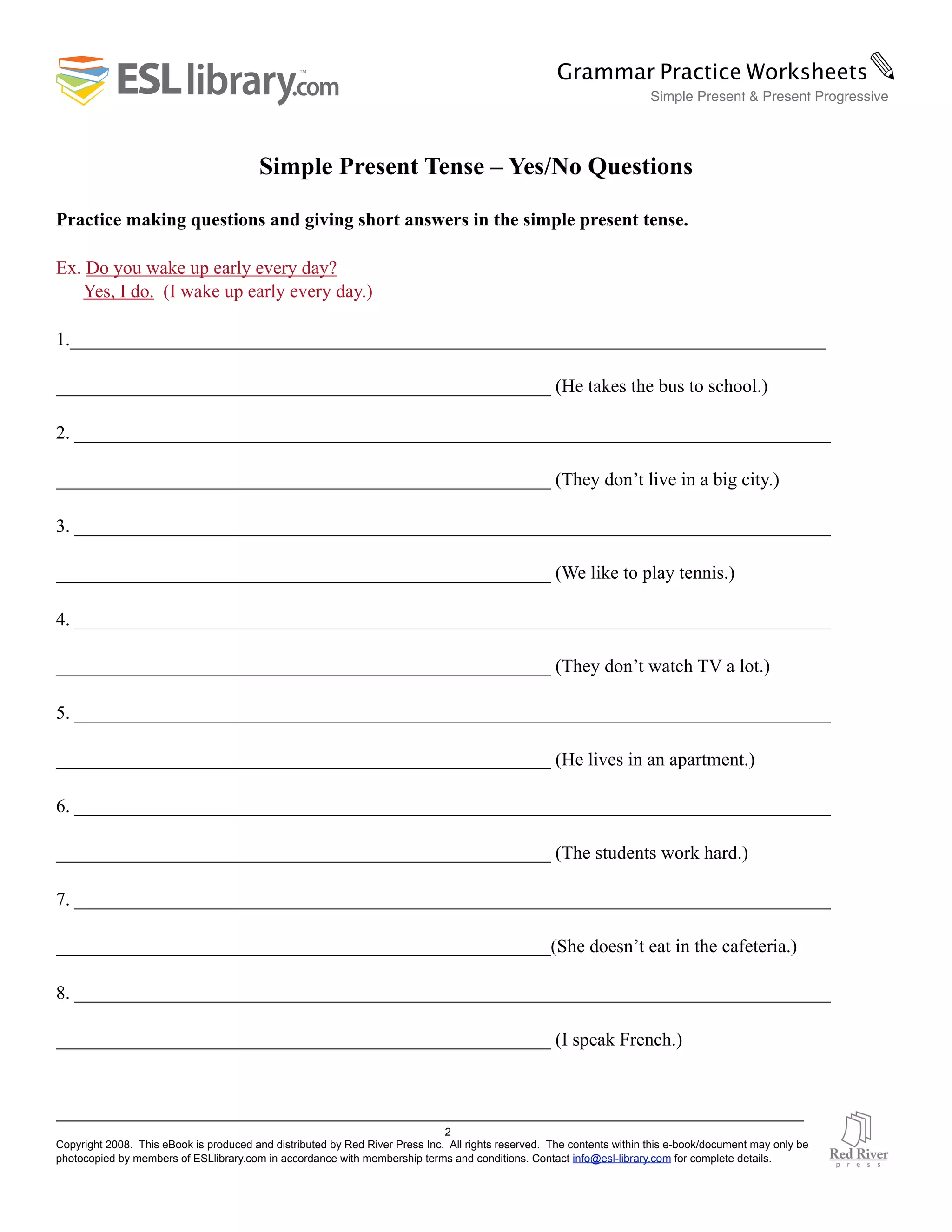 This document contains exercises for practicing verb tenses, including simple present, present progressive, and questions. There are fill-in-the-blank and short answer questions about daily habits and activities using verbs like eat, drink, speak, take and watch. Negative forms, frequency adverbs, and questions are also addressed.