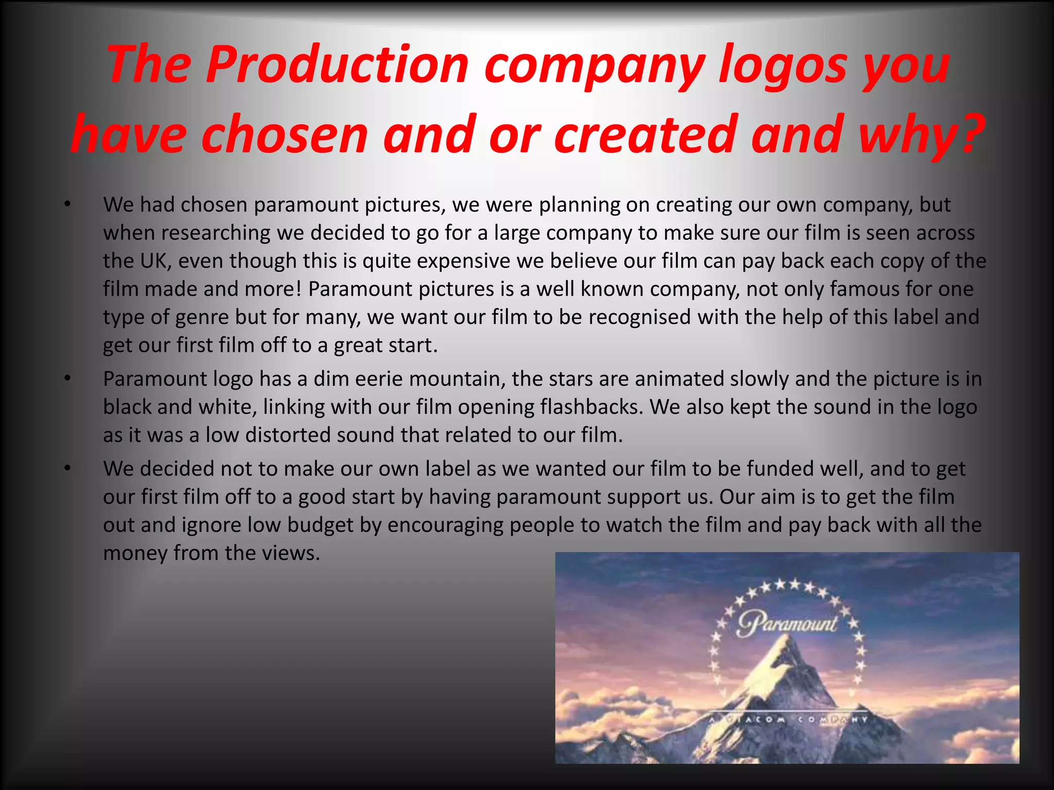 A production company is responsible for the actual production of a film, including funding, distribution to film studios and cinemas, and promoting the film. The authors chose Paramount Pictures as their production and distribution company because it is a large, well-known studio that could ensure their film was seen widely in cinemas across the UK. A distributor is responsible for releasing films to the public through theatrical screenings or home video formats like DVD. Paramount has its own distribution arm, making it a simpler option. The authors felt Paramount had a wide variety of genres it distributed and their psychological thriller would fit with films like Shutter Island the studio had previously distributed.
