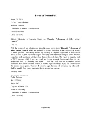 This document contains an internship report submitted by Taskin Rahman to his supervisor Dr. Md. Golam Morshed on the financial performance of Niloy Motors Limited. The report includes a letter of transmittal, student and supervisor declarations, acknowledgements, table of contents, and introduction. The introduction provides background on financial statement analysis and explains that the purpose of the report is to analyze Niloy Motors' financial performance through ratio analysis and compare key metrics to other companies.