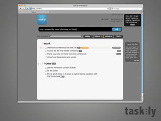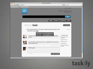 This document summarizes a task management tool called Taskly. It allows users to manage tasks in any workflow and supports getting things done more easily. The tool is designed to be easy to use, support any workflow, and actually help users complete tasks. It generates revenues through a freemium model with unlimited tasks for a $4 monthly fee. The company aims to grow through word of mouth, social media, and providing a helpful product to users.