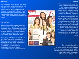 The document analyzes magazine covers and contents pages from three different music magazines - Classic FM, Kerrang!, and NME. It describes the images, fonts, colors, and layout used on each magazine's cover and contents page and how they relate to the magazine's target audience and genre of music covered. Key details like logos, coverlines, and fonts are examined and compared between the magazines.