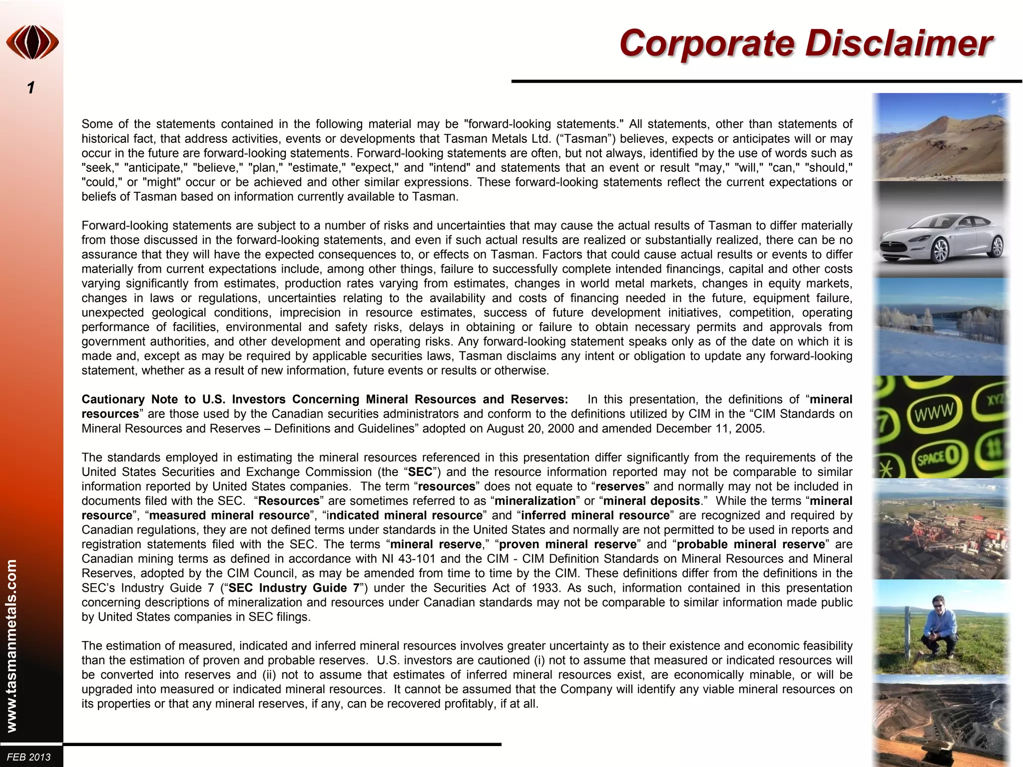 Tasman Metals Ltd is a Canadian mining company focused on rare earth elements (REE) in Europe. Its flagship project is Norra Karr in Sweden, which hosts the 4th largest heavy REE deposit in the world. A positive preliminary economic assessment for Norra Karr published in 2012 showed an after-tax NPV of over $1 billion using conservative metal pricing. Tasman also owns a portfolio of other REE projects in Scandinavia, well-located in stable jurisdictions with good infrastructure and supportive mining policies.