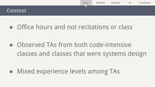 The document proposes a Teaching Assistant Scheduler & Question-Solver (TASQ) system to more efficiently manage teaching assistant office hours. TASQ would aggregate student questions, schedule students with similar questions together, and build a central repository of questions and answers. This would allow teaching assistants to better prepare for office hours, reduce redundant explanations, and make more efficient use of time. Potential issues that could arise include teaching assistants needing to spend more time outside of office hours managing questions and last-minute questions.