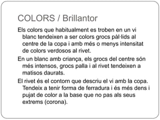 COLORS / BrillantorElscolors que habitualment es troben en un vi blanc tendeixen a ser colors grocs pàl·lids al centre de la copa i amb més o menys intensitat de colors verdosos al rivet.En un blanc amb criança, els grocs del centre són més intensos, grocs palla i al rivet tendeixen a matisos daurats.El rivet és el contorn que descriu el vi amb la copa. Tendeix a tenir forma de ferradura i és més dens i pujat de color a la base que no pas als seus extrems (corona).