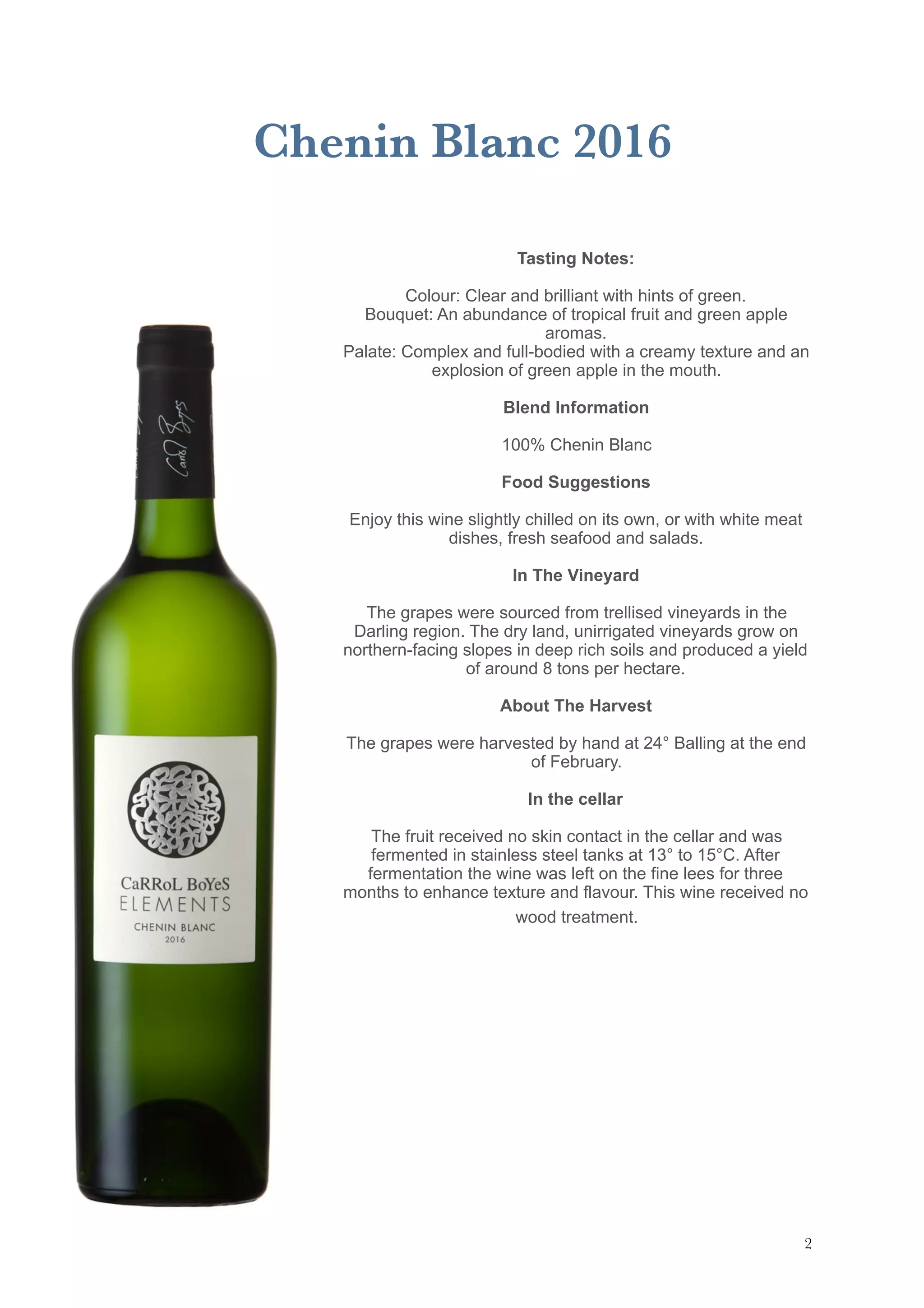 This document contains tasting notes and information about several wines, including Chenin Blanc, Pinotage, Merlot, Cabernet Sauvignon, Shiraz, Cape Blend, and two MCC (methode champenoise) sparkling wines. The summaries provide key details about the grapes, vineyards, harvest details, winemaking processes, and tasting notes for each wine.