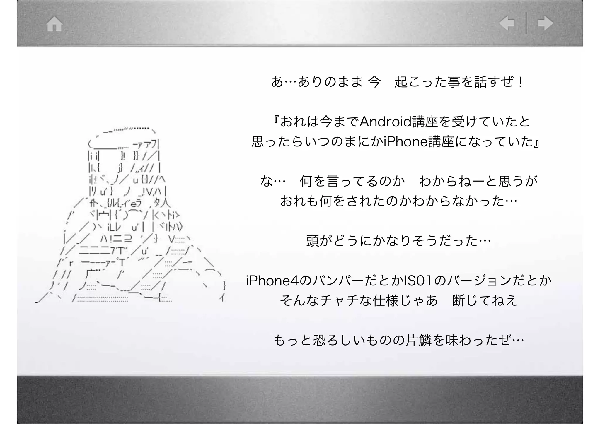 あ…ありのまま 今 起こった事を話すぜ! 『おれは今までAndroid講座を受けていたと 思ったらいつのまにかiPhone講座になっていた』