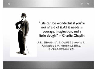 時間=情熱 技術力) • プログラミングが難しくても諦めず続けてみる • 既存のリソースを活用(Dwarfs standing on the shoulders of giants) 2. Imagination (ユーザー視点) • User Experience = おもてなし。アプリは使いやすいか?感動はあ るか? • 新製品の価値というのは、突き詰めると二つしかない。「今まで より楽しい」か、「今までより楽」か。 3. A little dough (サムマネー) • 価格以上の価値を感じてもらう。技術への感謝の形。 • 信者と書いて「儲ける」。信じる者(ユーザー)を増やす。